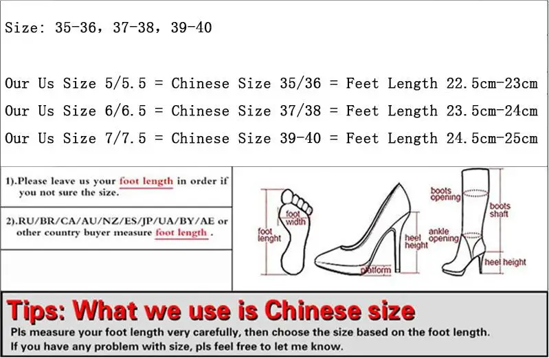 Our Us Size 6/6.5 = Chinese Size 37/38 = Feet Length 23.5cm-24cm