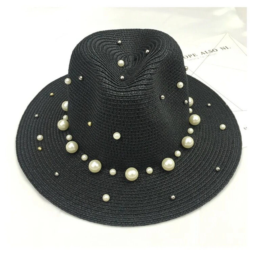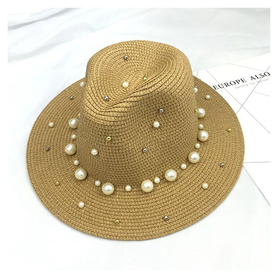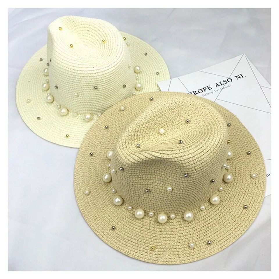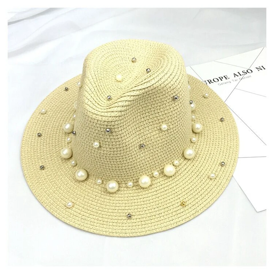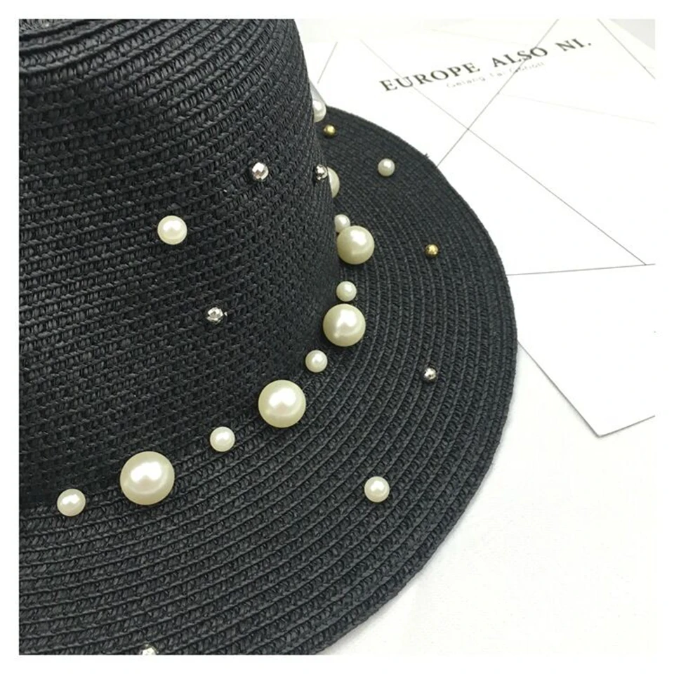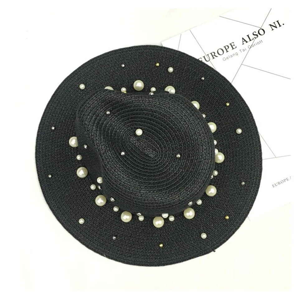 2018 New Summer British pearl beading flat brimmed straw hat Shading sun hat Lady beach hat