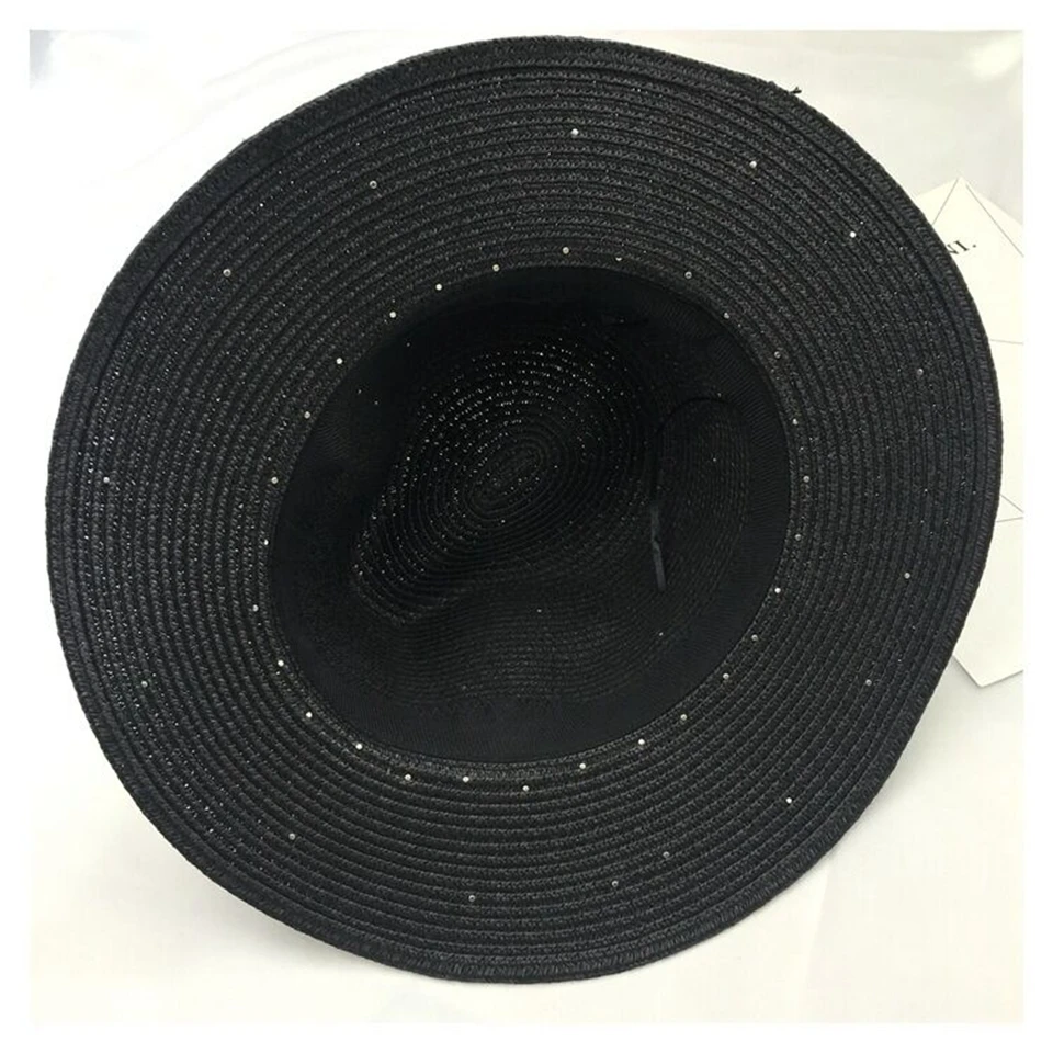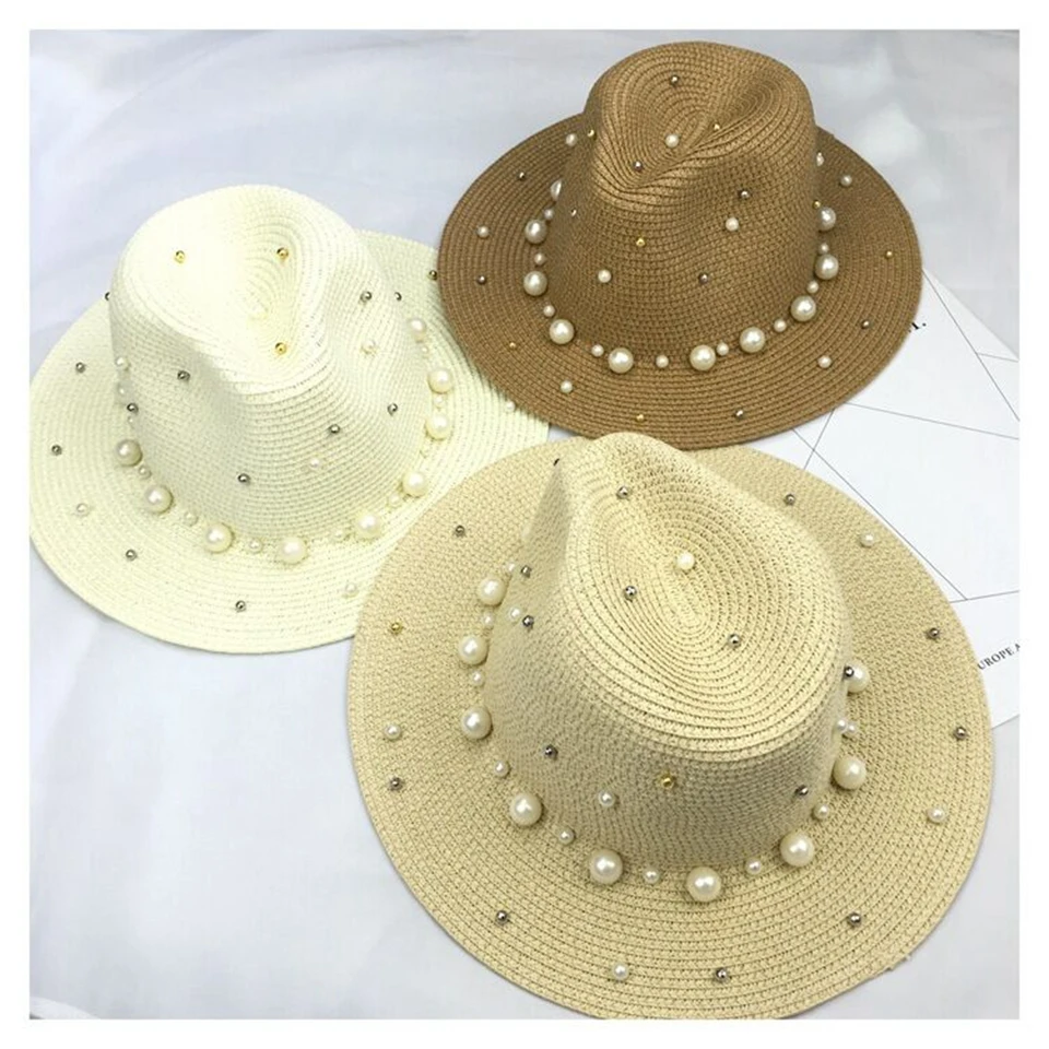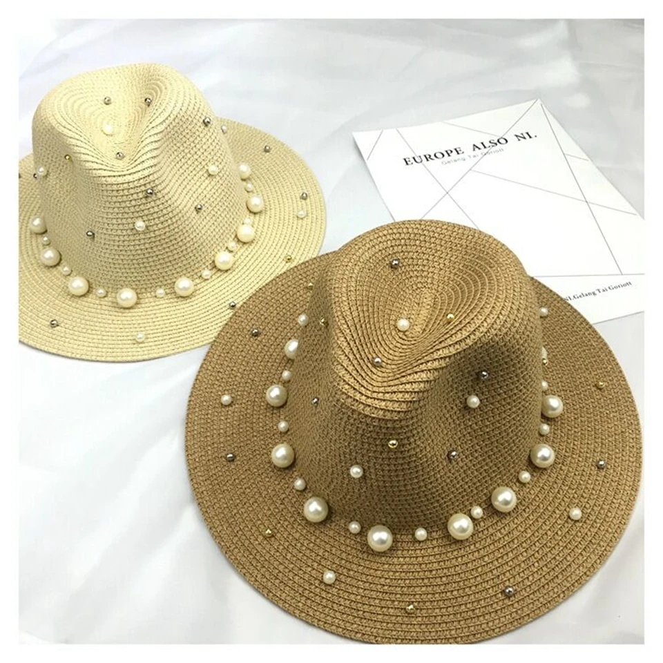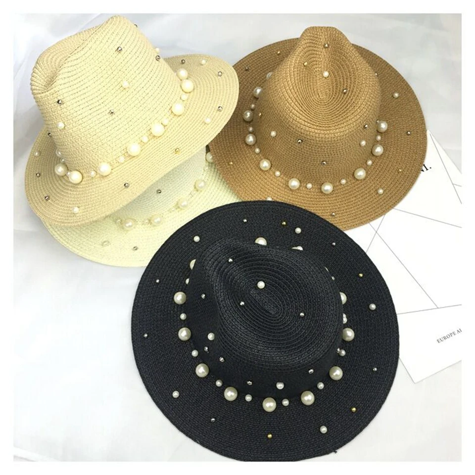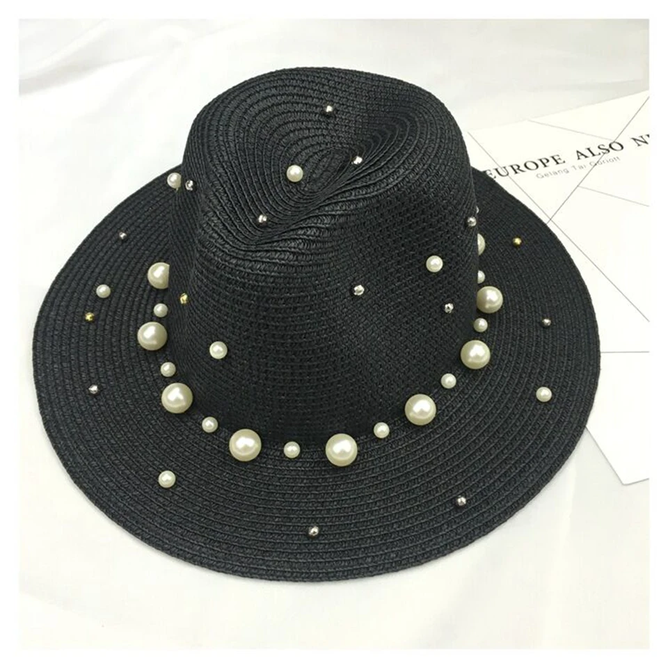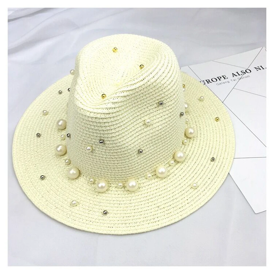 2018 New Summer British pearl beading flat brimmed straw hat Shading sun hat Lady beach hat
