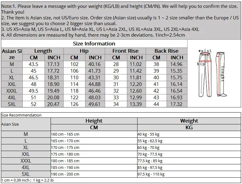 Note: Our size is Asia size. Asia size is about 2 Size smaller than the US, EU, Brazil, Russia Size .If you do not know how to choose the size. Please tell me your height and weight.