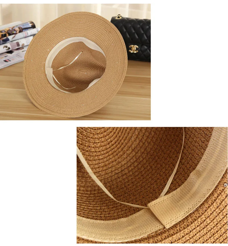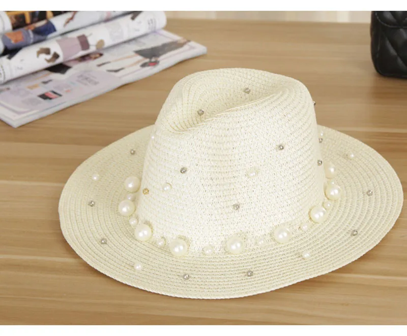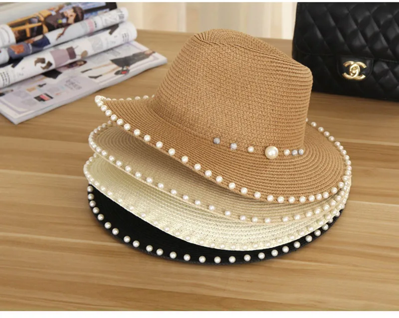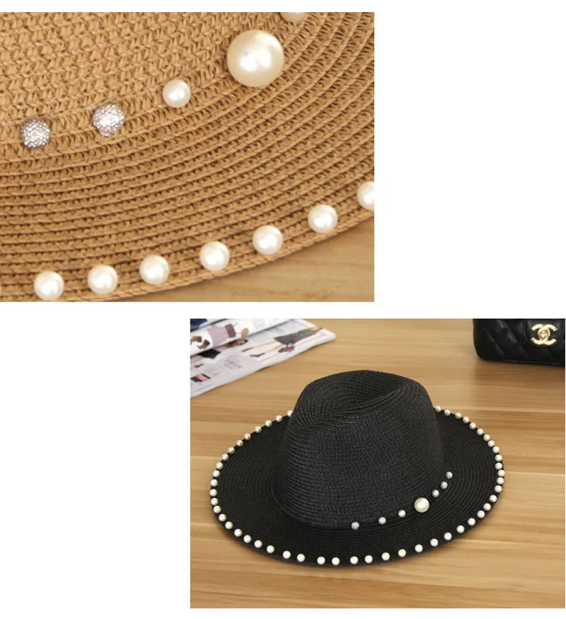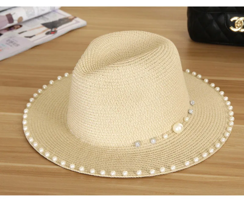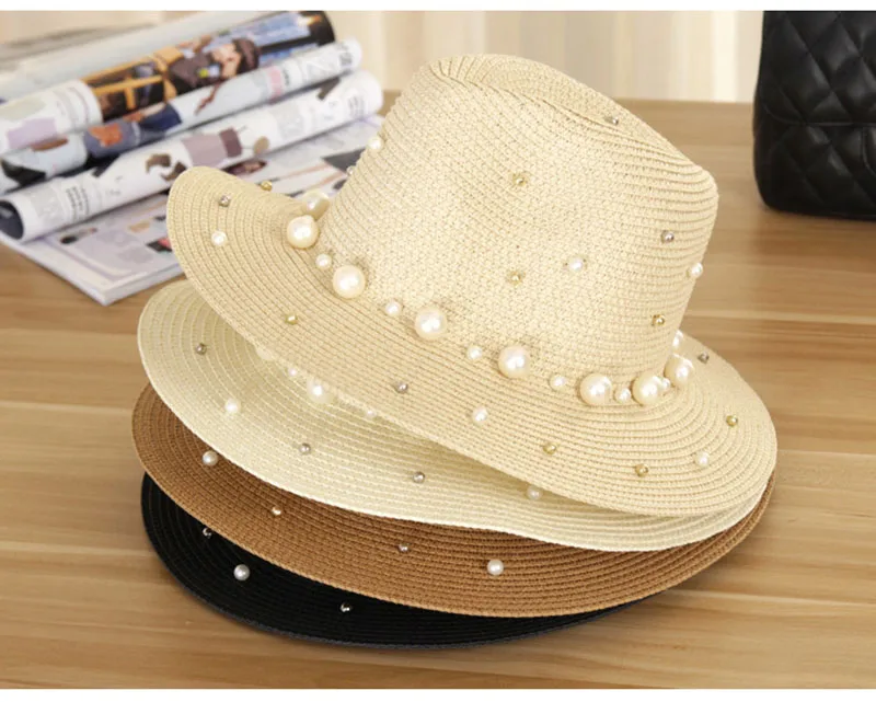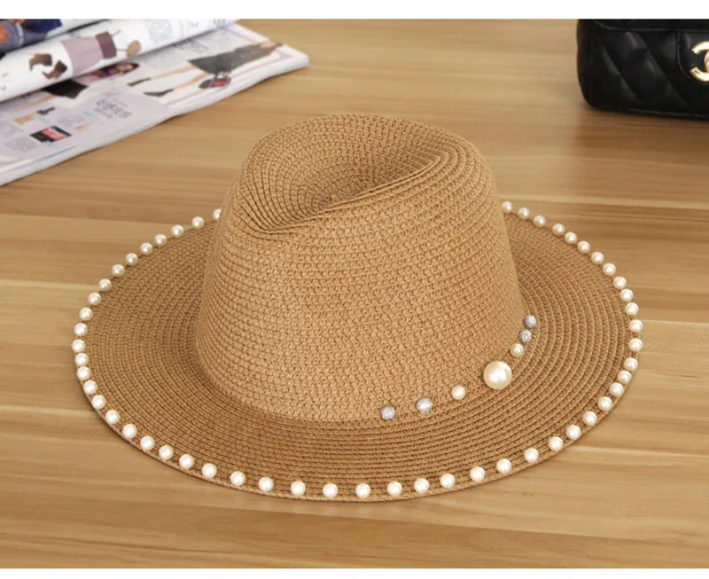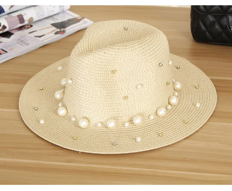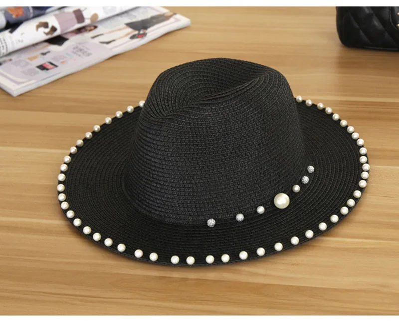 2018 New Summer Women’s Outdoor Sun Hats Solid Big Brim Straw Breathable Adjustable Snapback Hat Fashion Pearl Top Cap For Lady