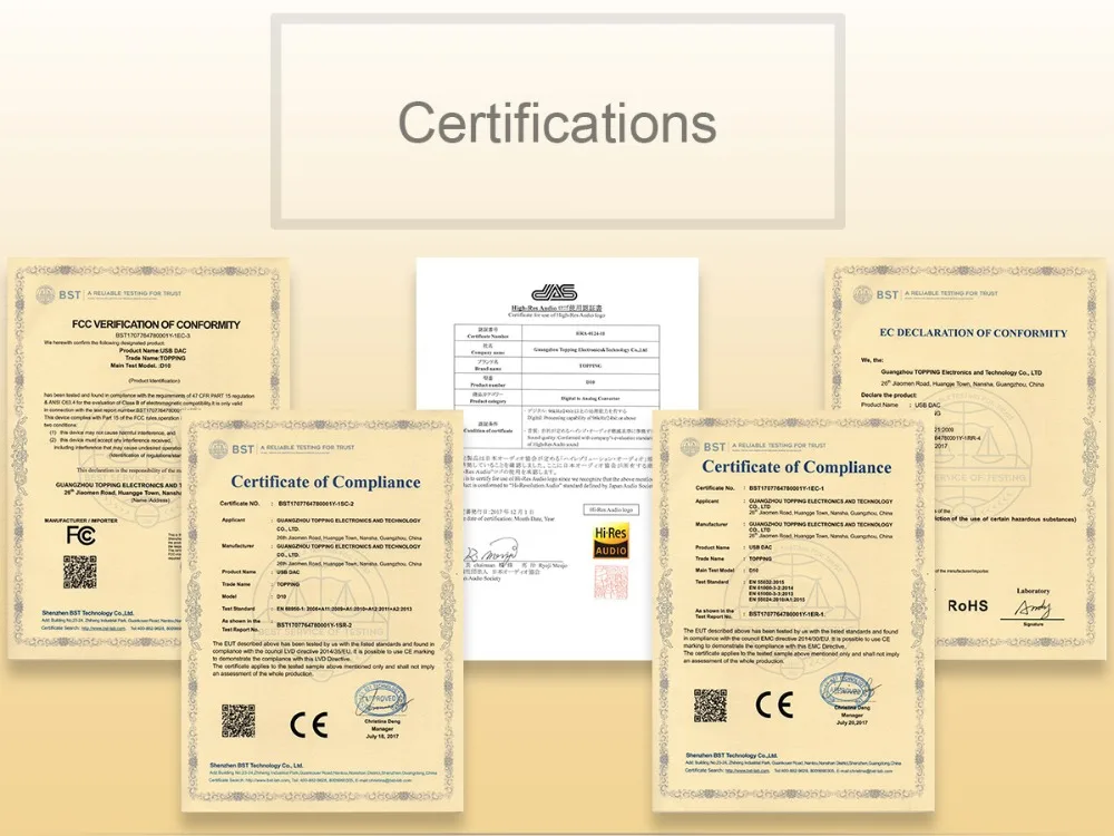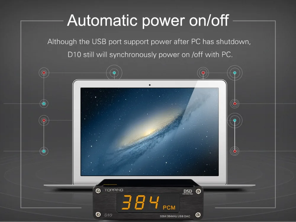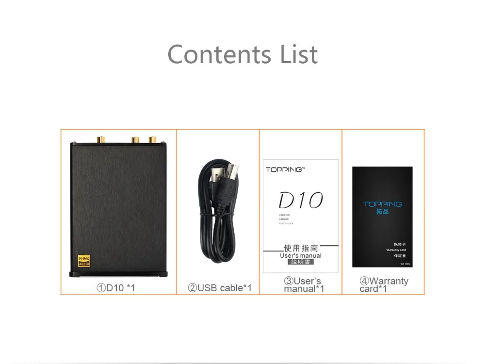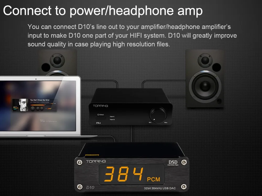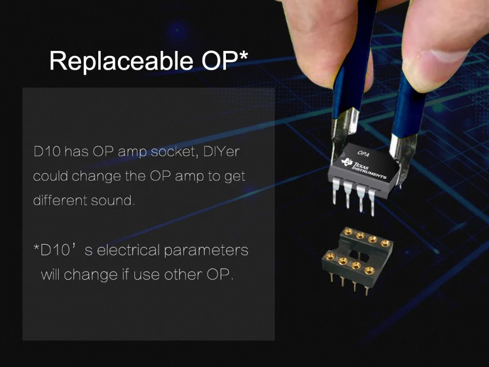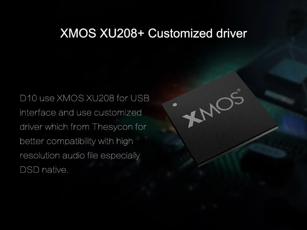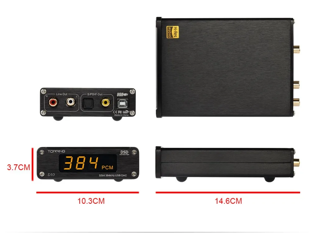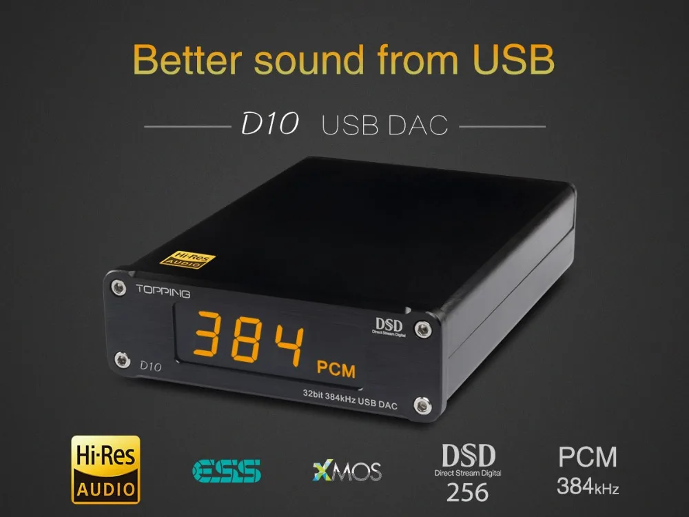 TOPPING D10 is a USB DAC with Line out, Optical and Coaxial output. It use XMOS(XU208) + ES9018K2M + OPA2134 and customized Thesycon driver(Windows) to support maximum PCM384kHz/32bit and DSD256(Native) decode and display the format & sampling rate by indicator. D10 also provide OP socket to make DIYers more easily to change another OP to get different sound effect. D10 is compatible with Android, Windows(7 or above), MAC and D10 is able to automatically turn on/off synchronize with the computer. D10 has Hi-Res Audio, CE, ROHS and FCC certificate.