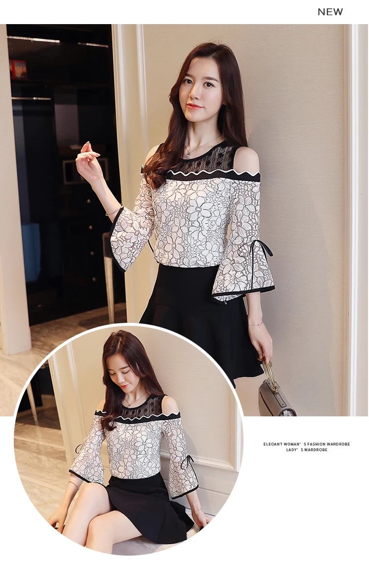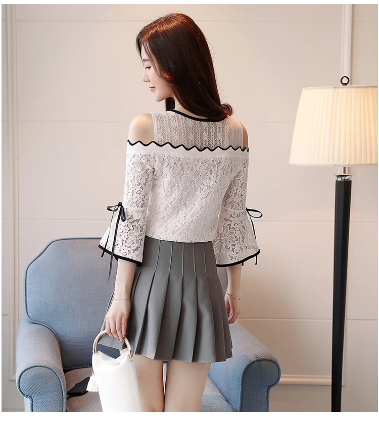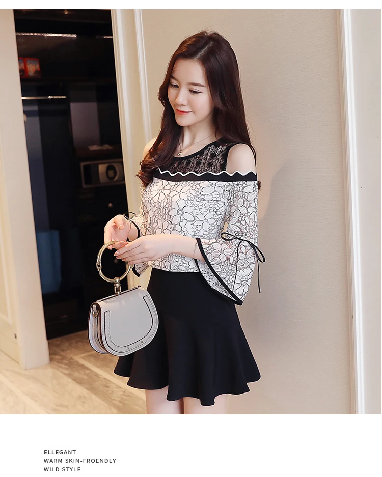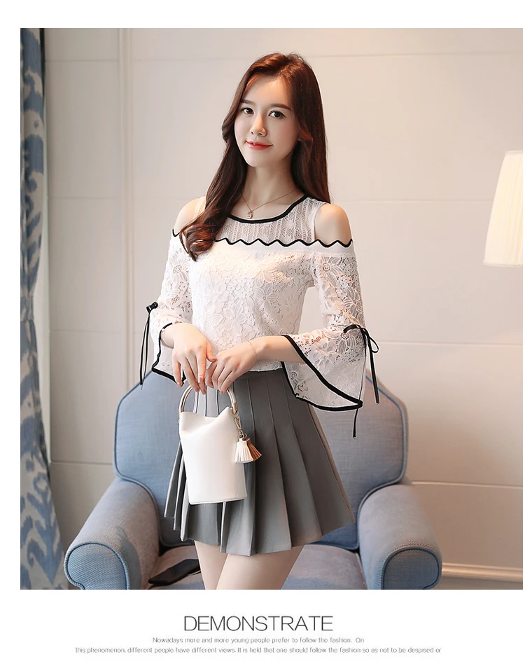 2018 New Women’s Fashion Lace Chiffon Stitching Blouse Flare Sleeve Top Lace O-neck Blouse Strapless Sexy Women Clothing D597 30