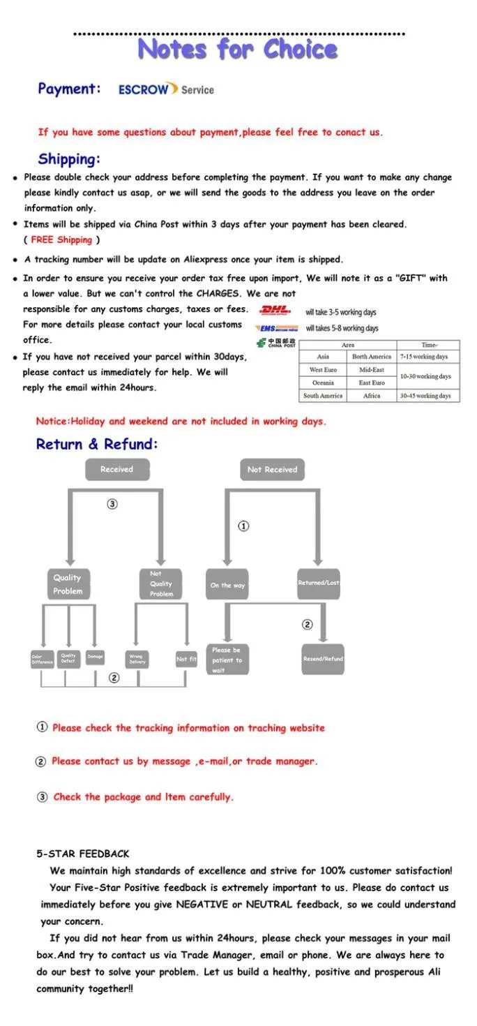 • If you did not receive the product within the guaranteed time( 45 days not including 2-5 day processing) you can request a refund or a reshipment.
