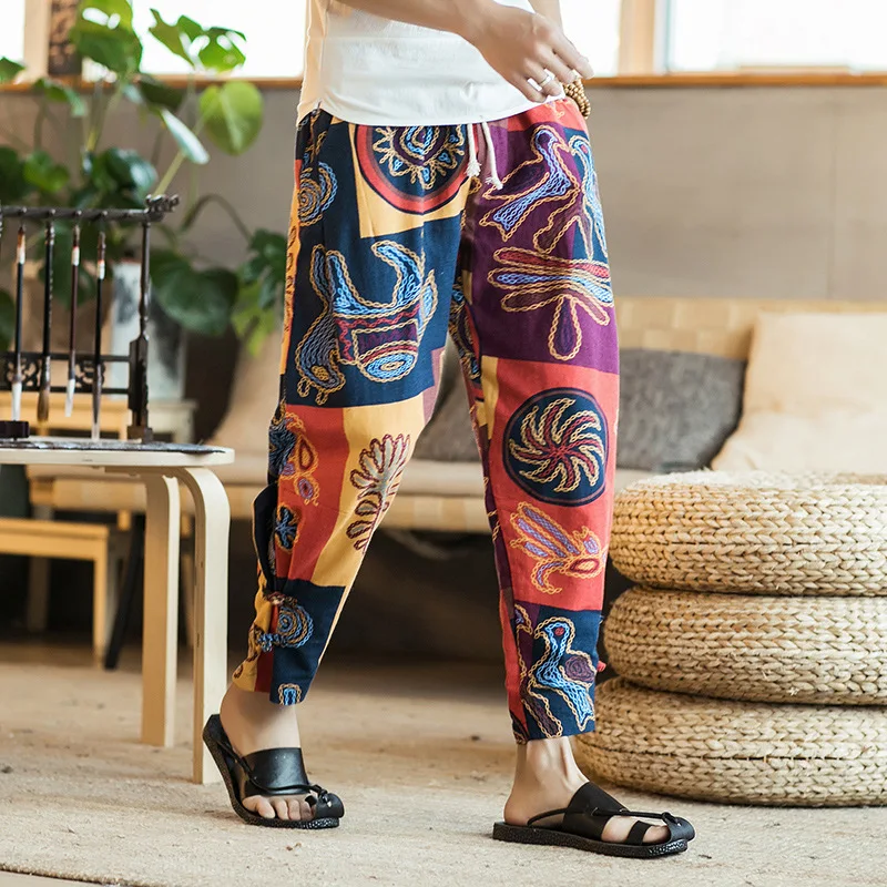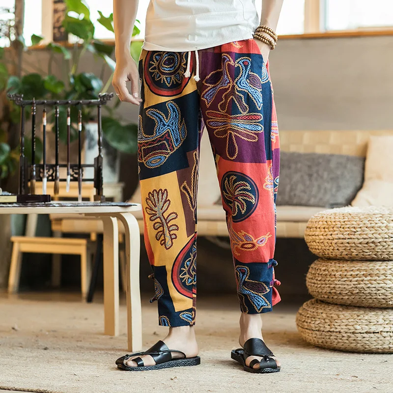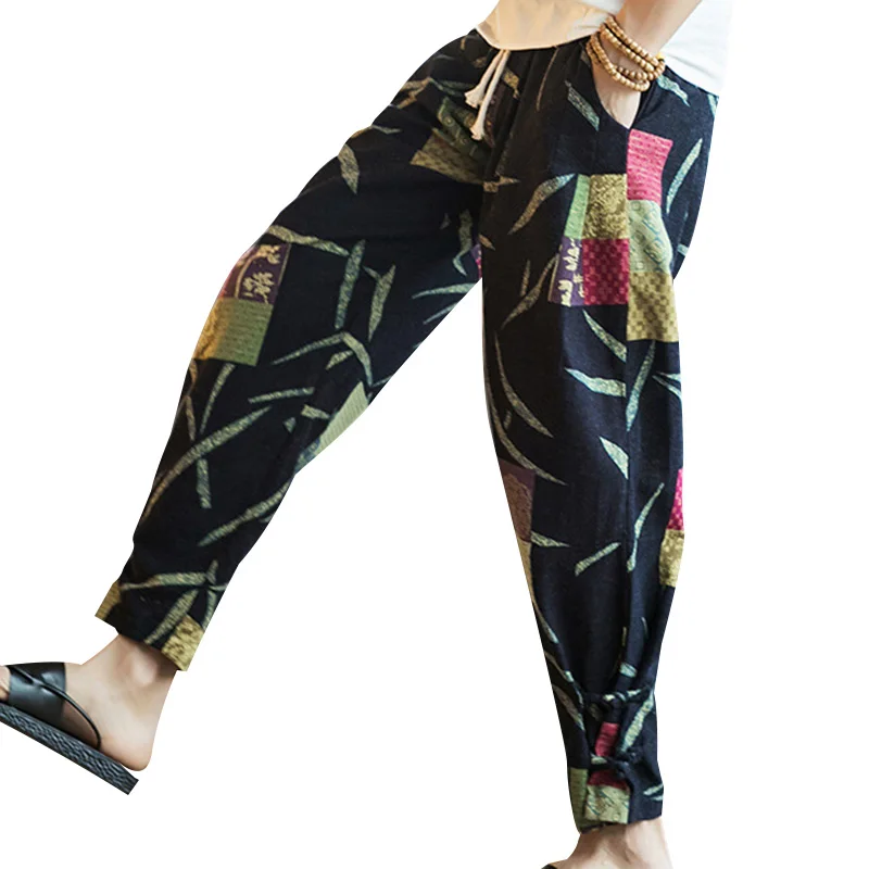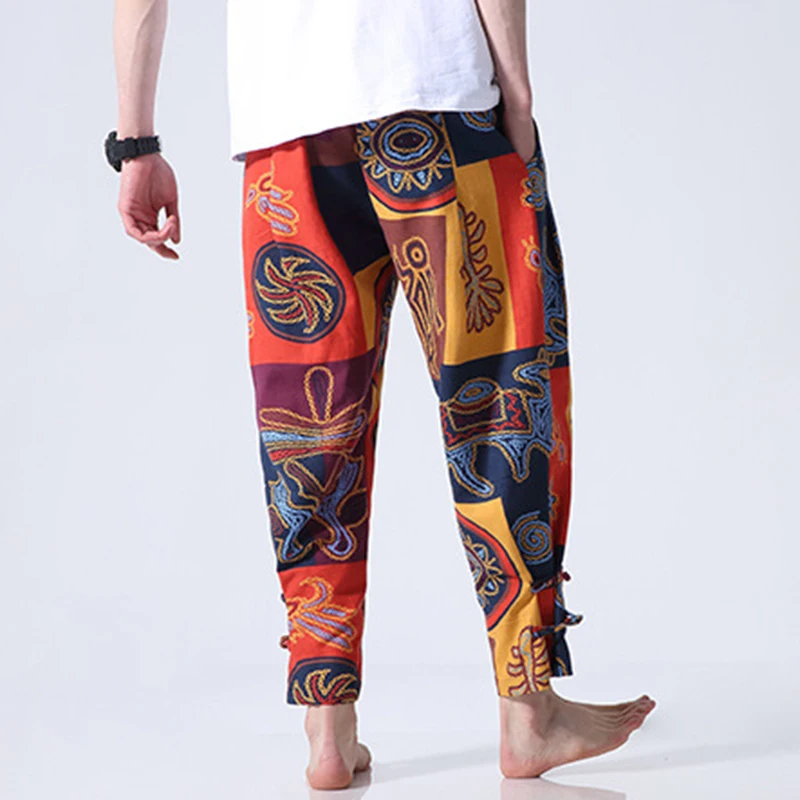 2018 Plus Size Casual Men Pants Chinese Style Ethnic Print Cotton Loose Elastic Waist Trousers Men Fashion Harem Pants Pantalon