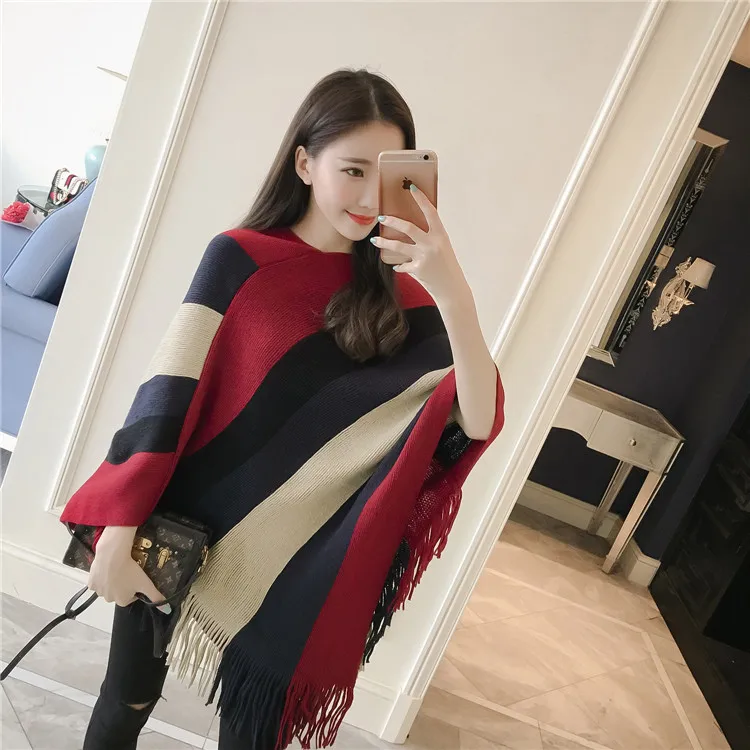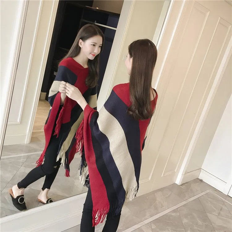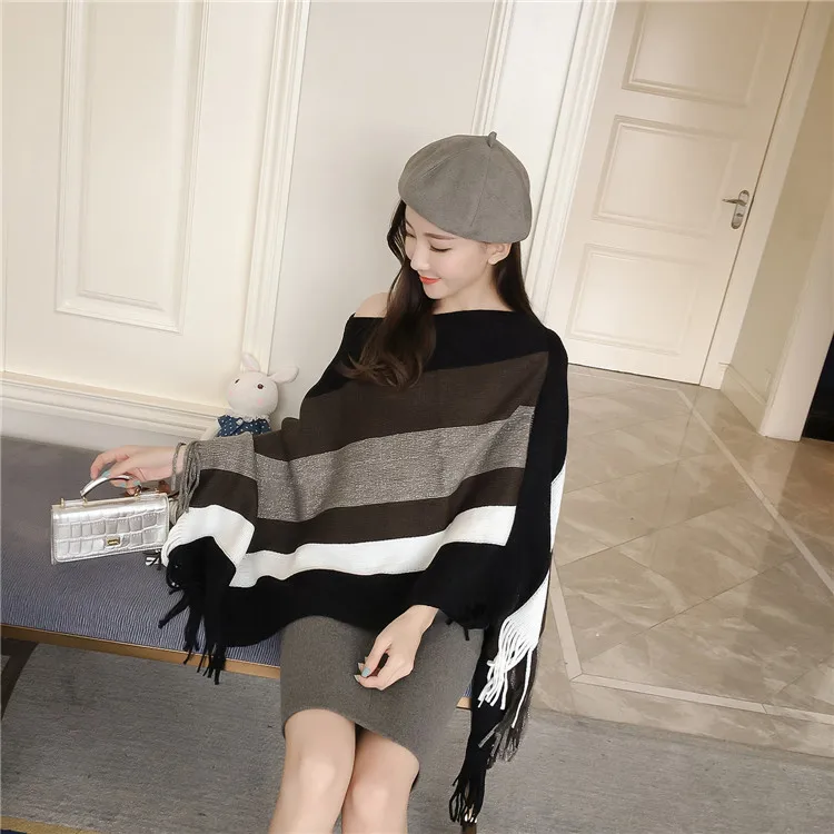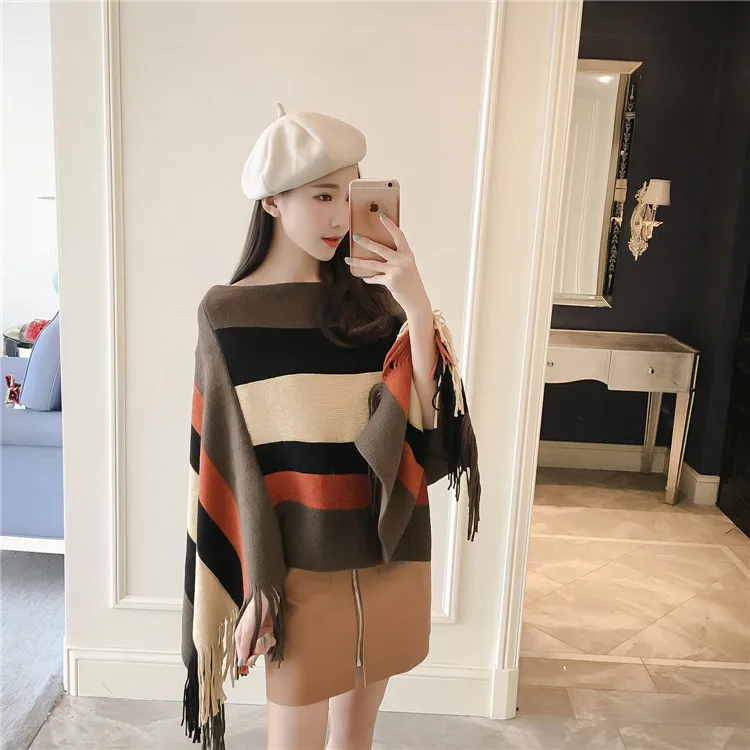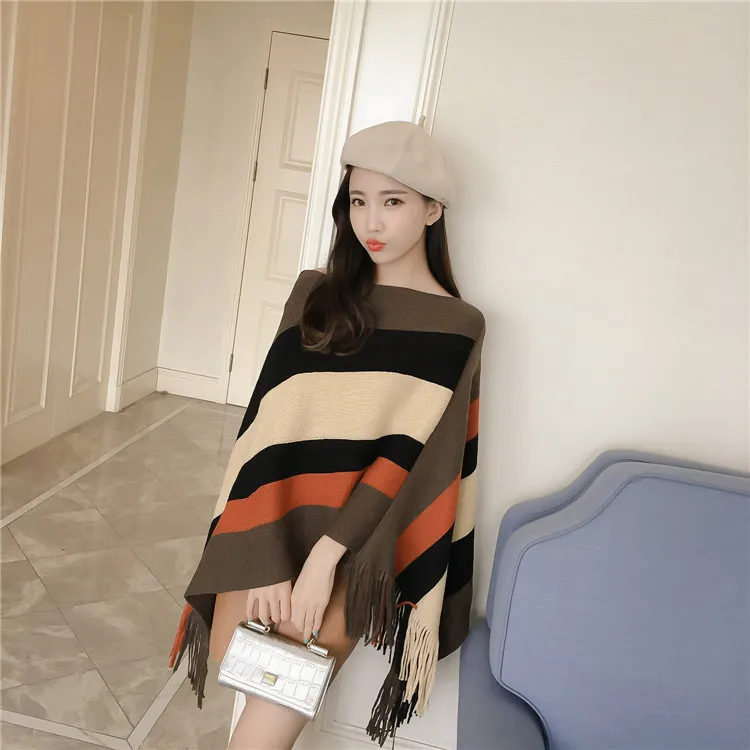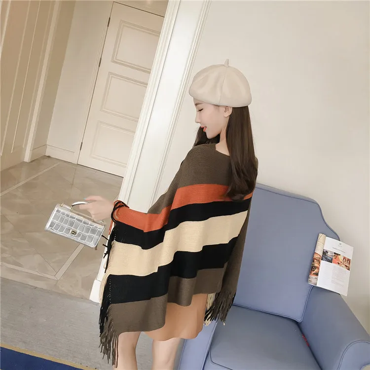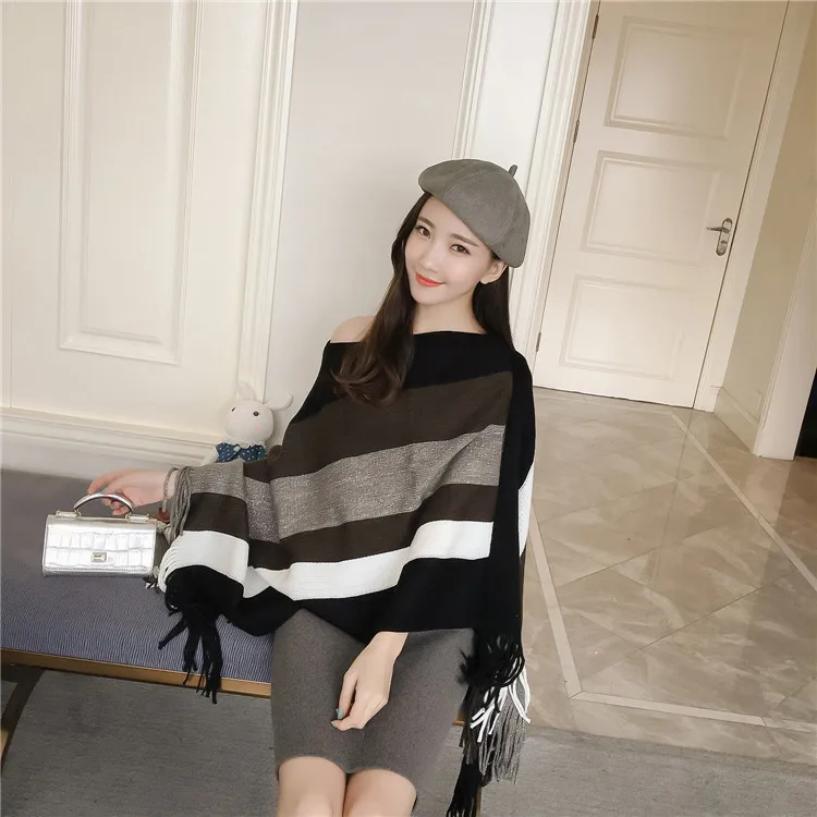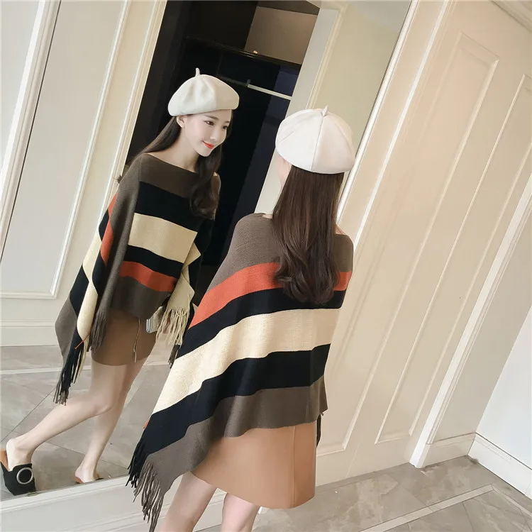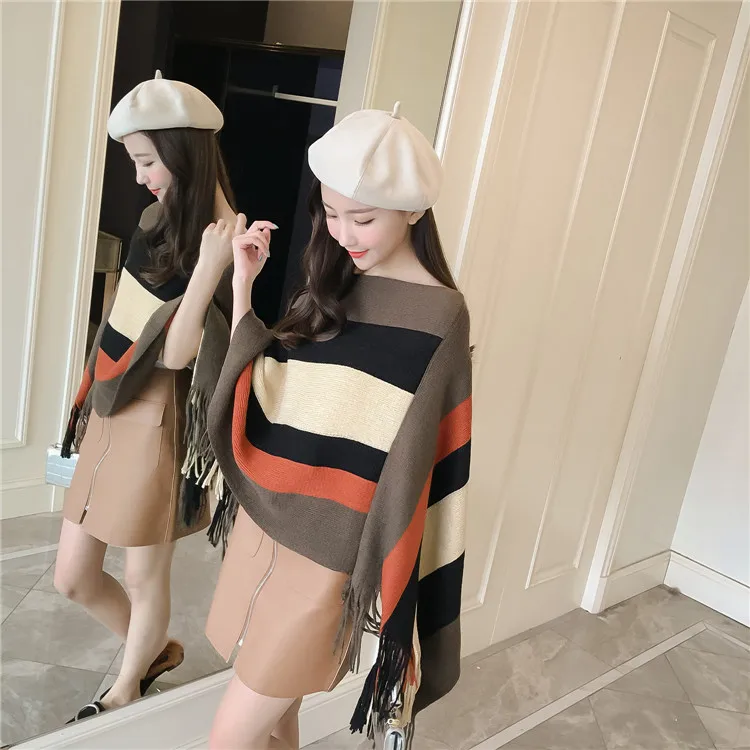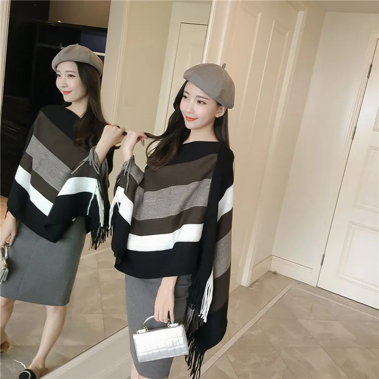 2018 Scarf Women Striped Ponchos And Capes Bat Sleeve Women Pullover And Sweater Tassels Poncho Cloak Coat Outwear 3 Colors