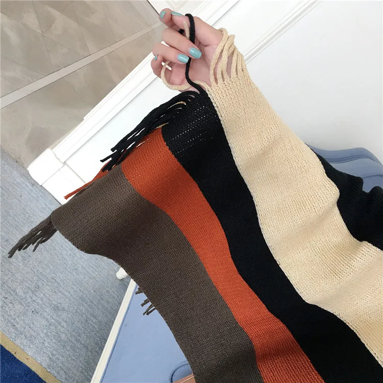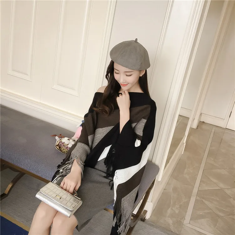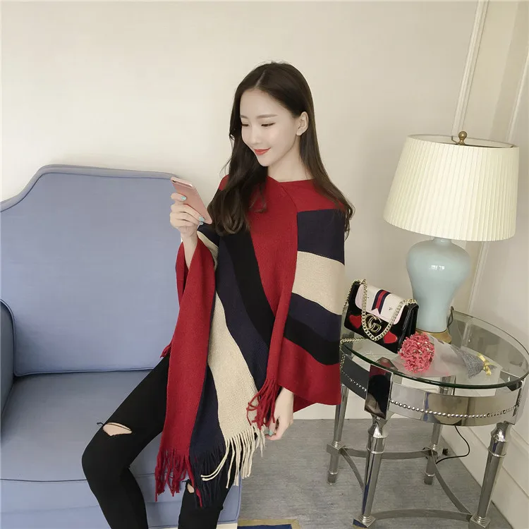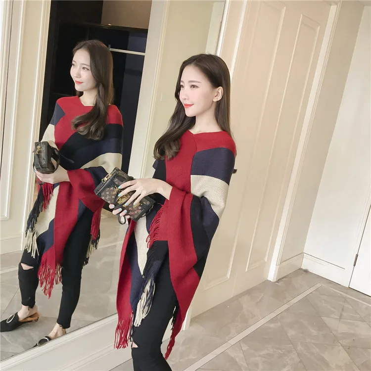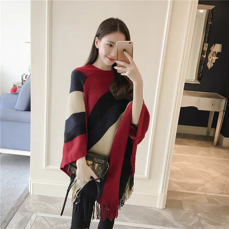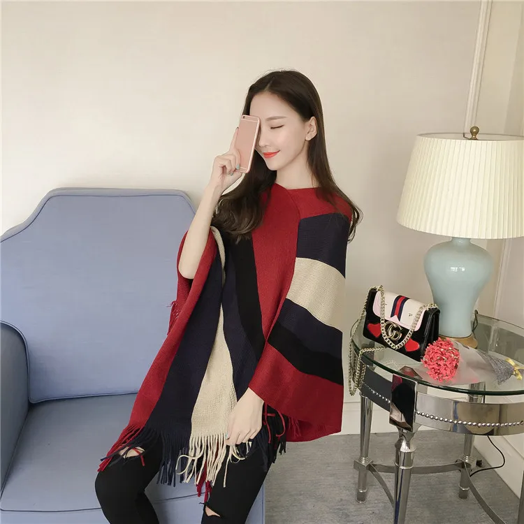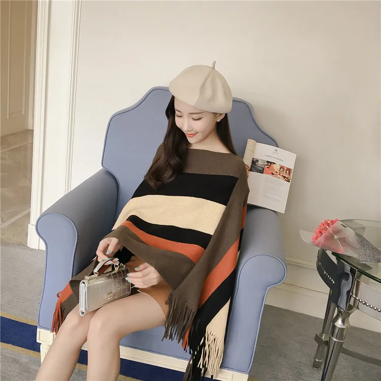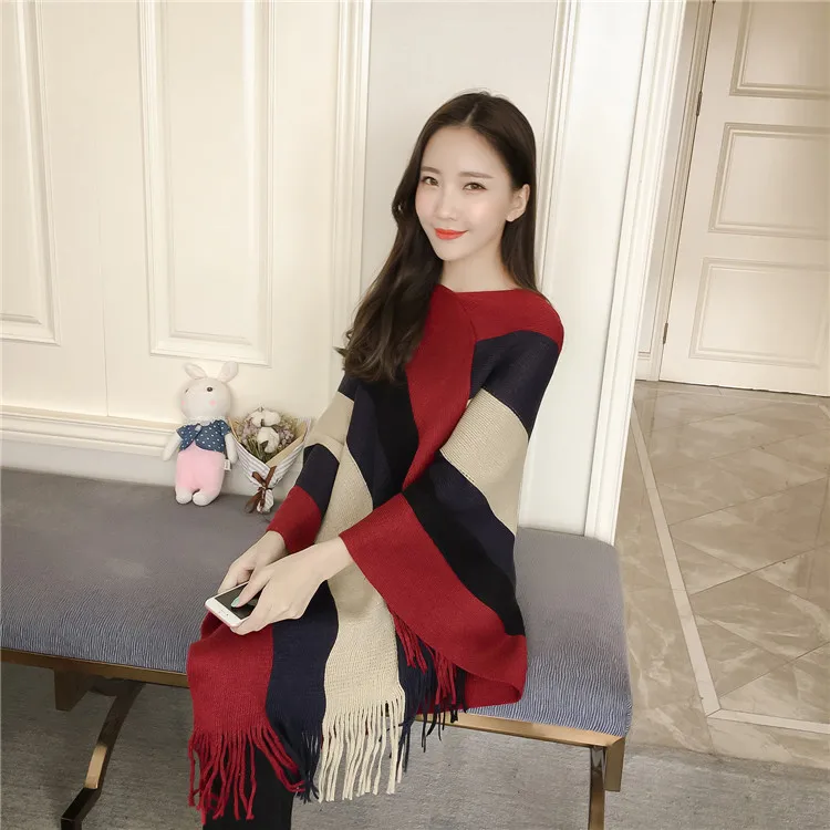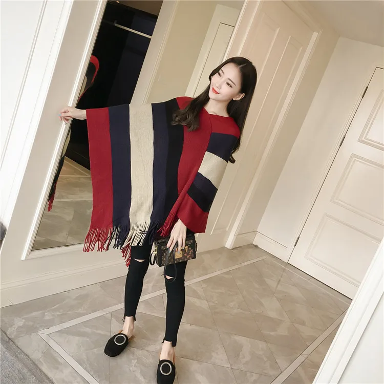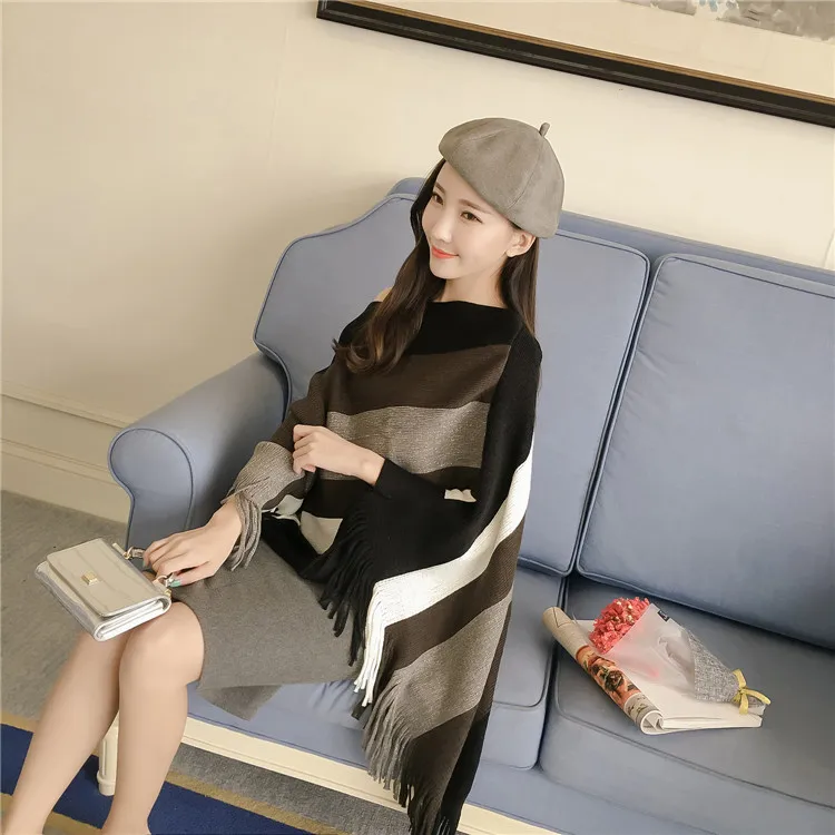 2018 Scarf Women Striped Ponchos And Capes Bat Sleeve Women Pullover And Sweater Tassels Poncho Cloak Coat Outwear 3 Colors