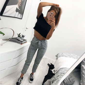 2018 SCHMICKER Women Casual Work Office High Elastic Waist Pockets Striped Baggy Harem Pants Turnip Trousers Wide Leg Pantalon