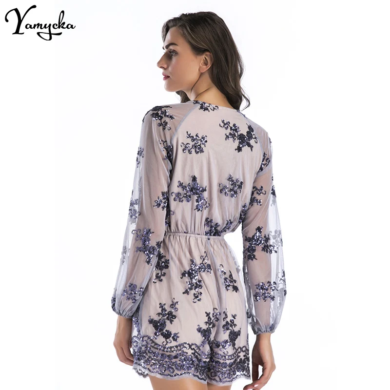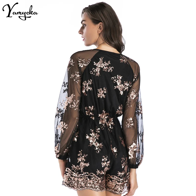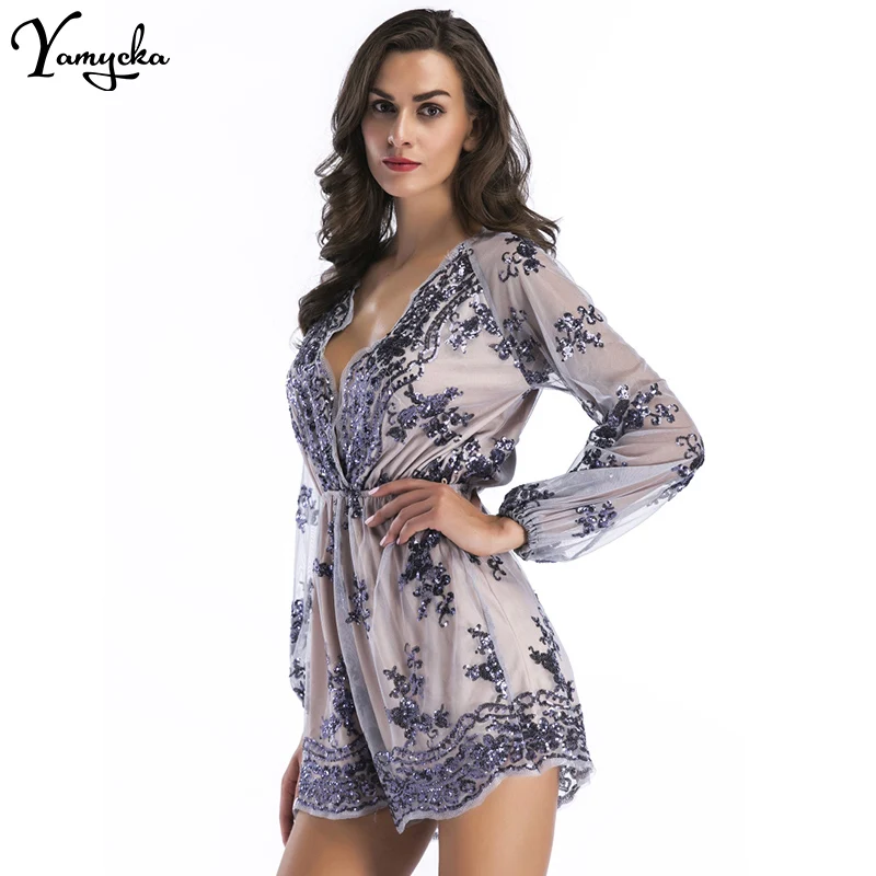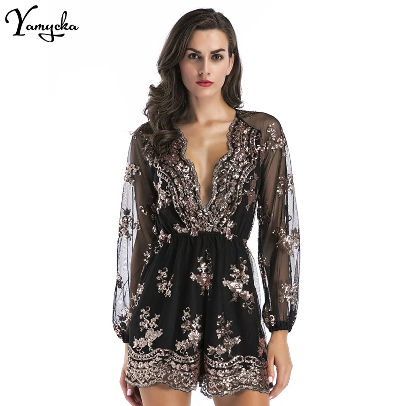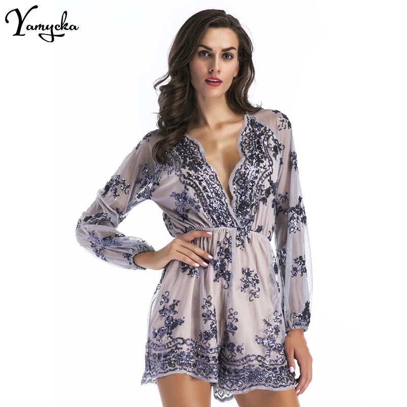 2018 Sexy Women Sequins Body Embroidery Jumpsuit Tassel Short Romper Luxury Nightclub Party Mesh Sleeve Playsuit V Neck Overalls
