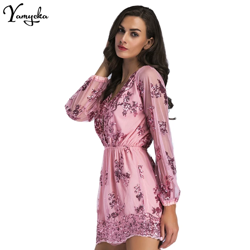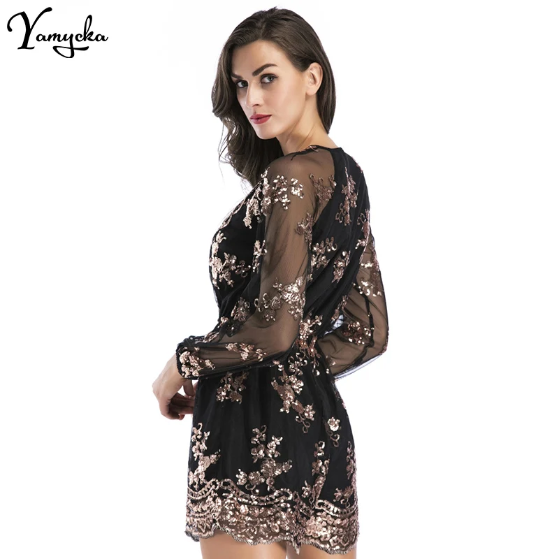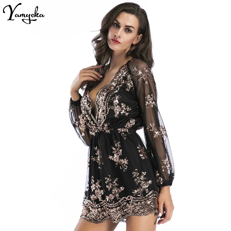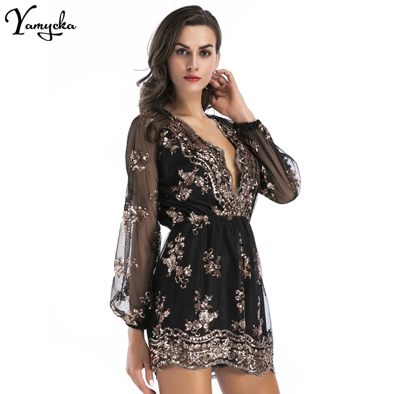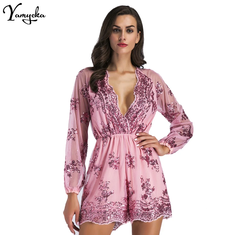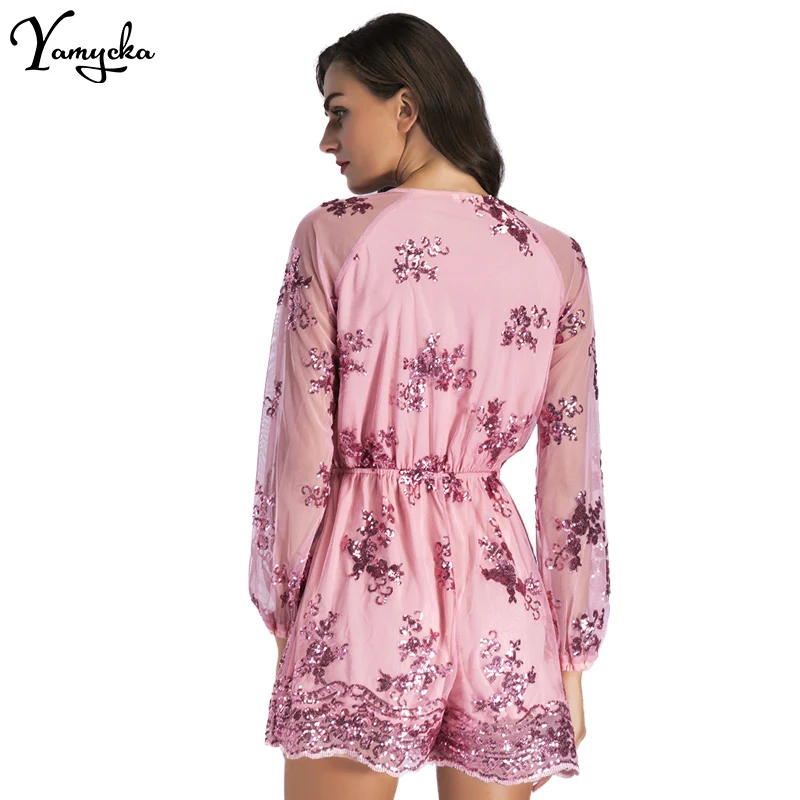 2018 Sexy Women Sequins Body Embroidery Jumpsuit Tassel Short Romper Luxury Nightclub Party Mesh Sleeve Playsuit V Neck Overalls