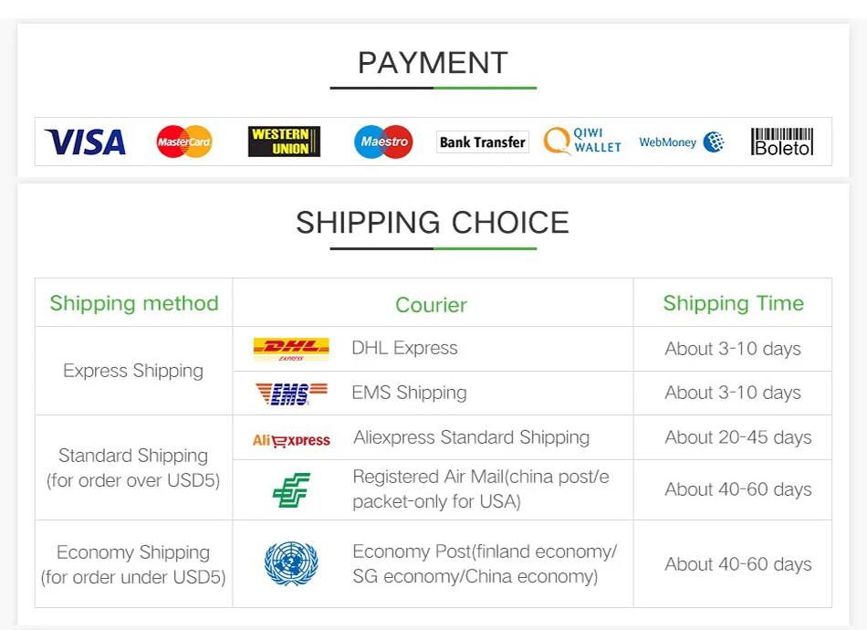 Packages from our warehouse in China will be shipped by ePacket or EMS depending on the weight and size of the product. Packages shipped from our US warehouse are shipped through USPS.