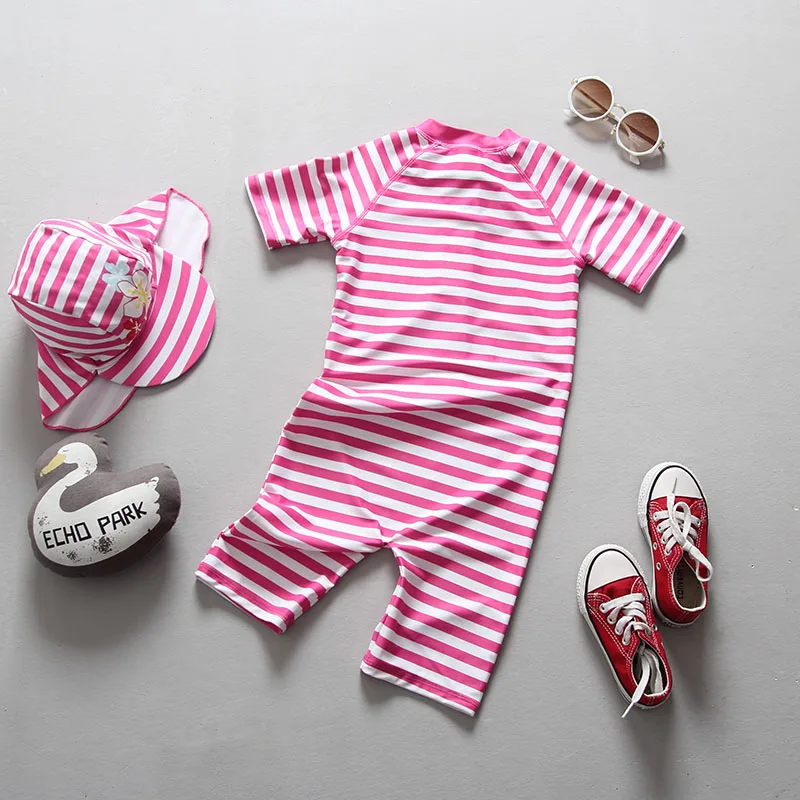 2018 Summer Baby Swimwear Lovely Children Girls Swimming Suit Miraculous Ladybug Striped Swimsuit with UV Suncreen Cap UPF50+