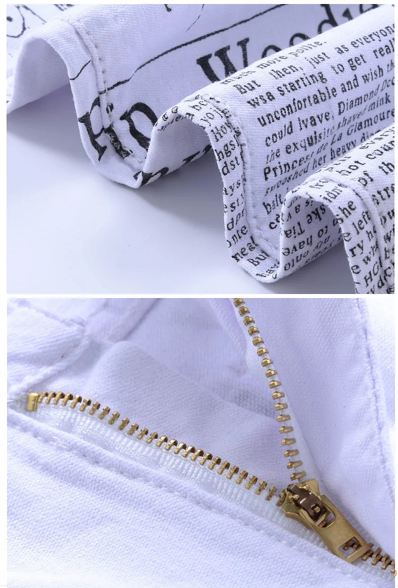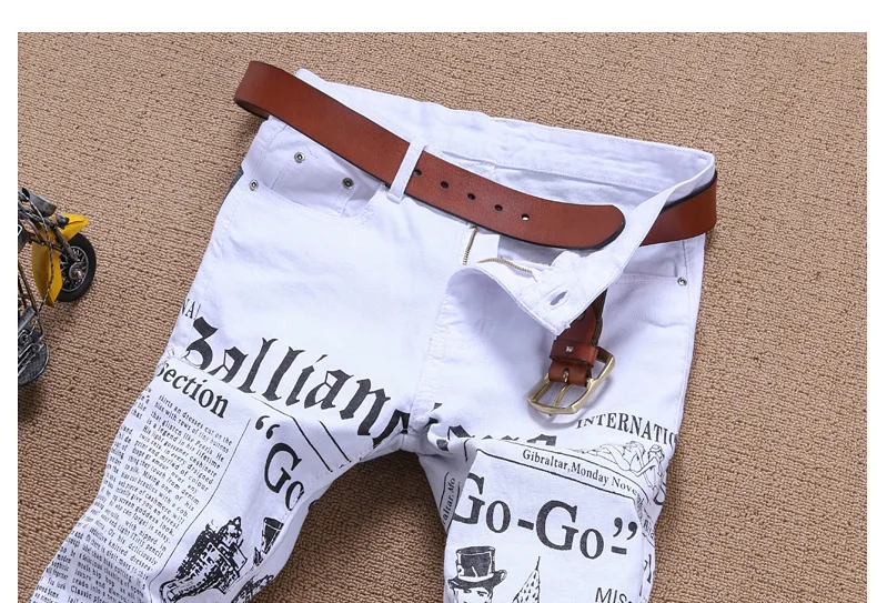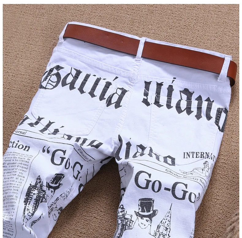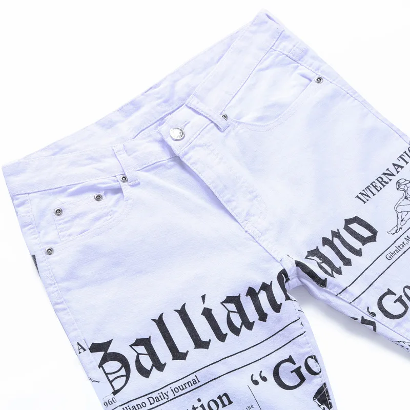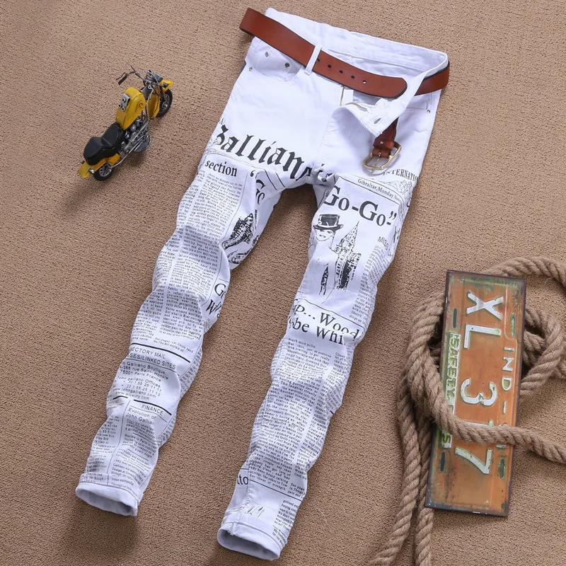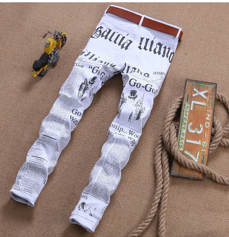 2018 Summer fashion newspaper print white men jeans personality straight punk style slim fit plus size 42 male denim trousers