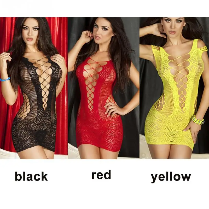 2018 Summer New Women Hot sexy mesh hollow out bodycon package hip mini dress nightdress Black/Red/Yellow