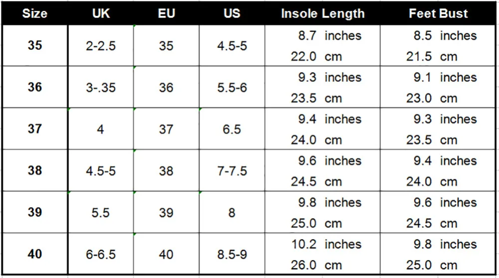 38: EU 38 US 7-7.5 UK 4.5-5 24.5 cm 24 cm