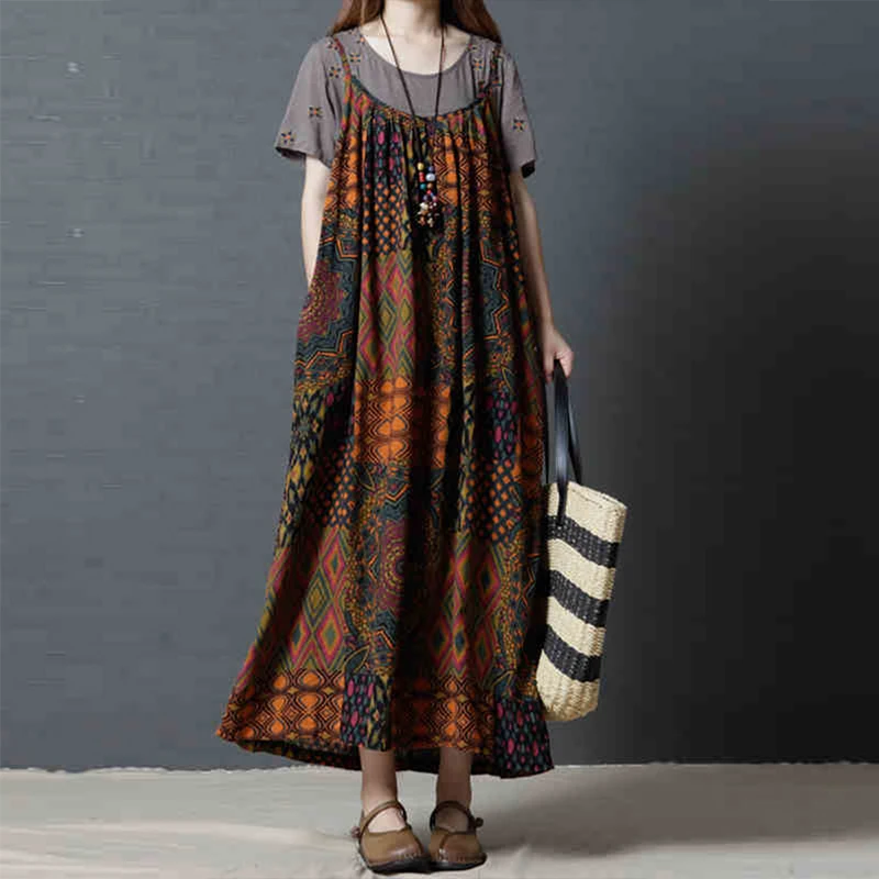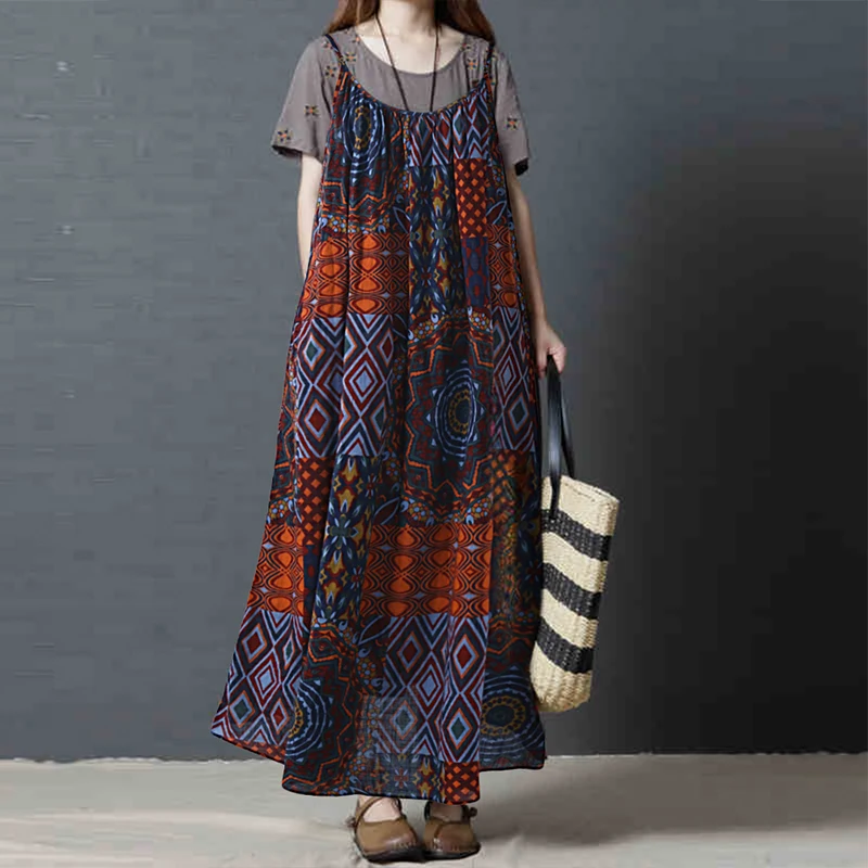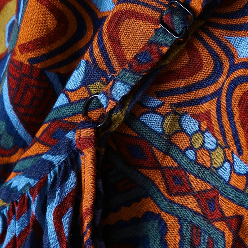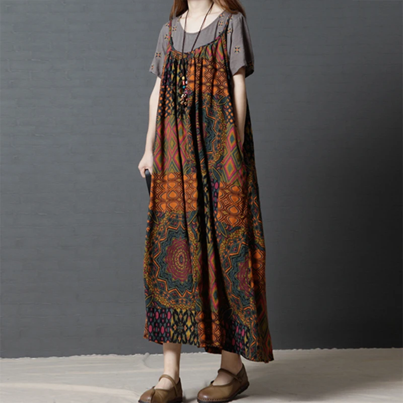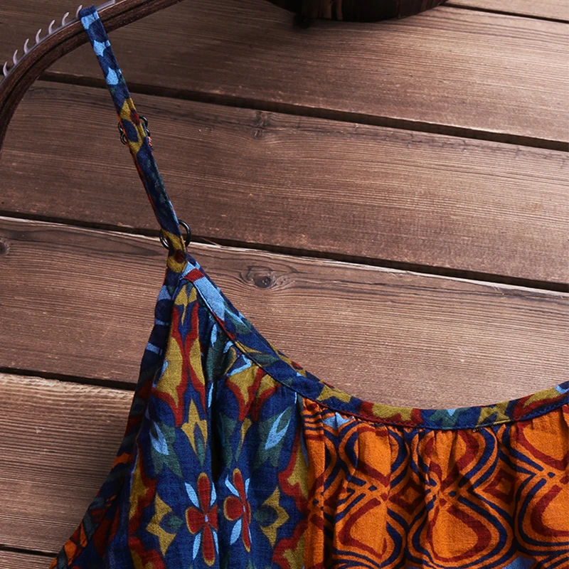 2018 Summer Women Strappy Sleeveless Bohemian Floral Printed Casual Loose Dress Cotton Linen Overalls Dress Vintage Long Vestido