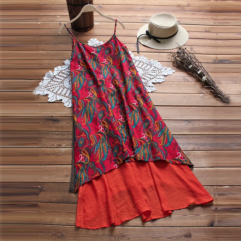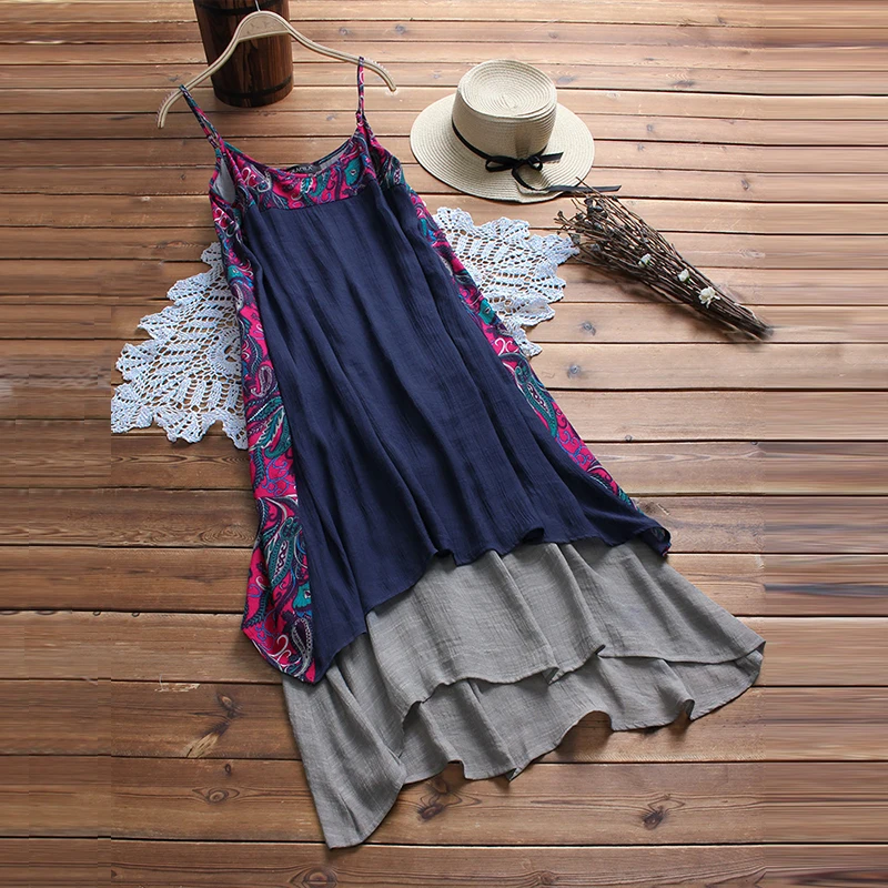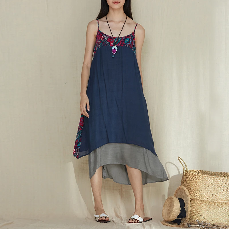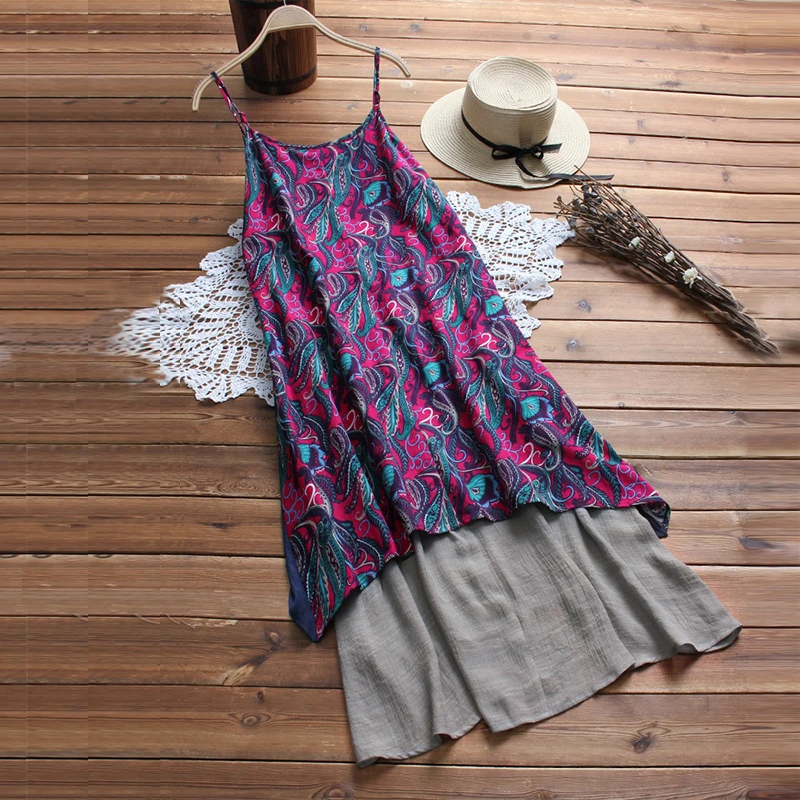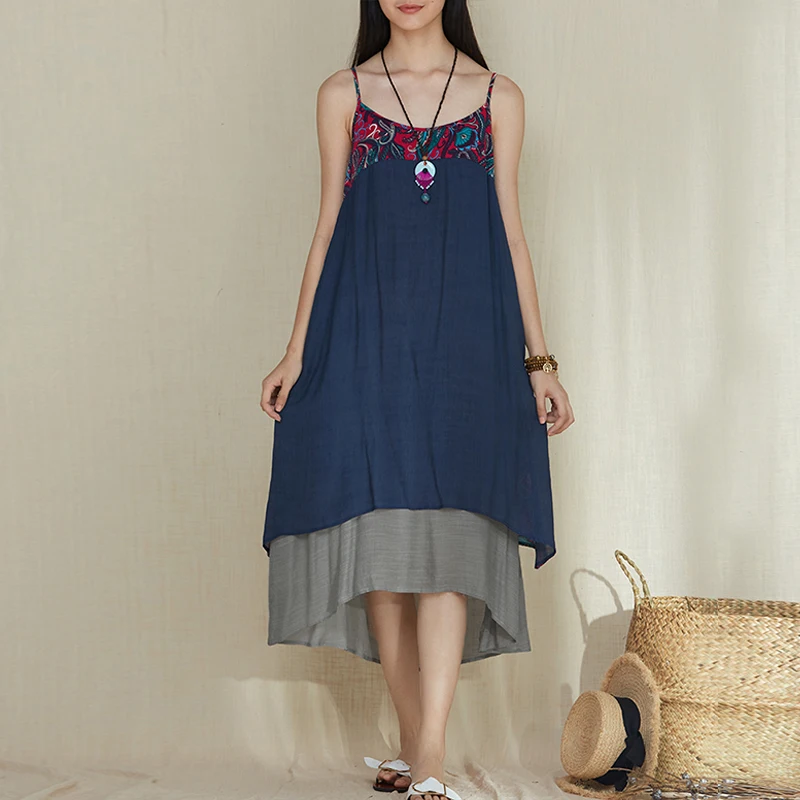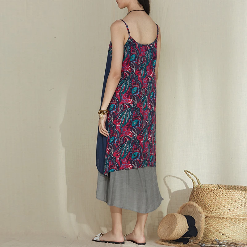 2018 Vintage Women Sleeveless Floral Printed Beach Dress Summer Strappy Loose Casual Boho Patchwork Cotton Linen Long Vestido