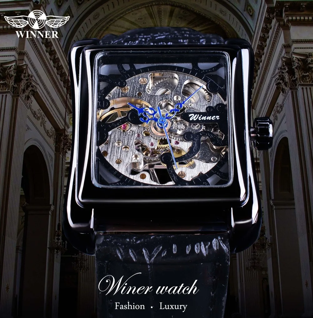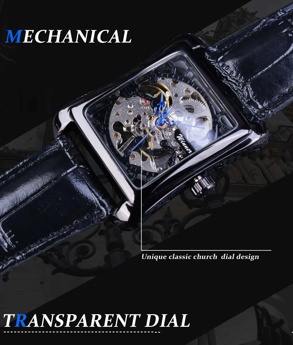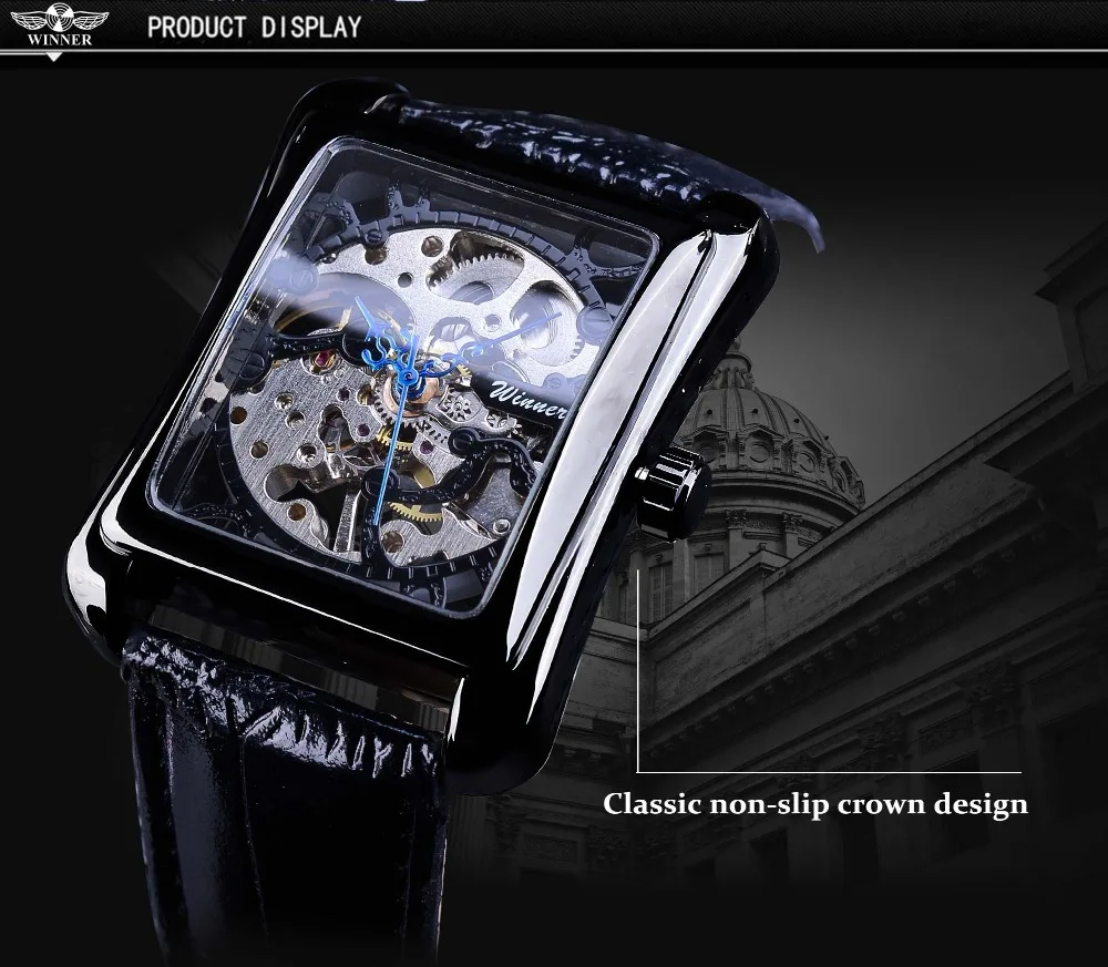 2018 Winner Brand Retro Casual Series Rectangle Dial Design Golden Pattern Hollow Skeleton Watch Men Top Luxury Mechanical Clock