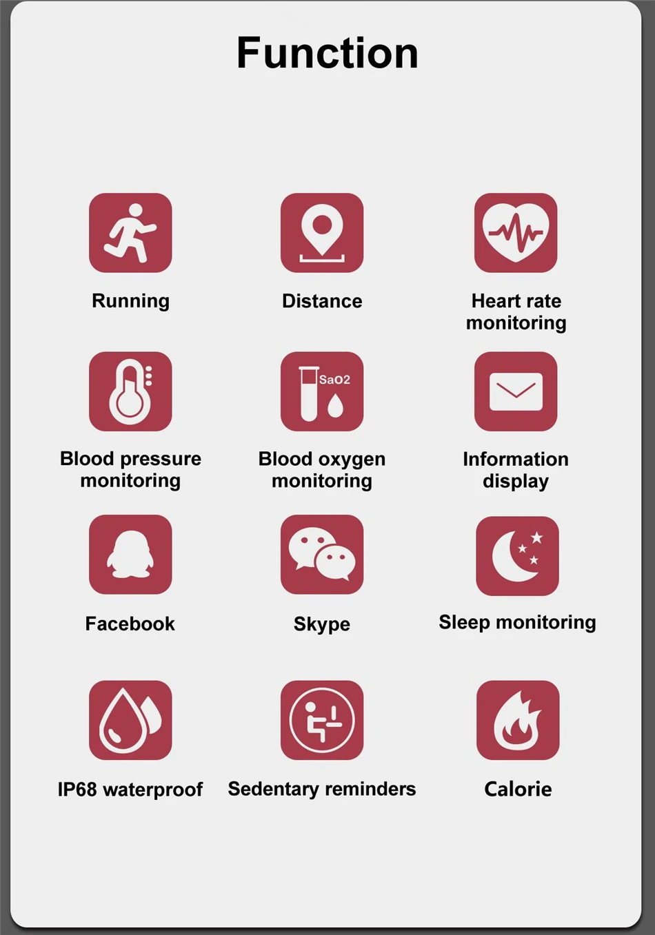 Step,Calories,Distance,Call reminder ,Alarm Reminder ,Social share(wechat、QQ、Facebook、Twitter)