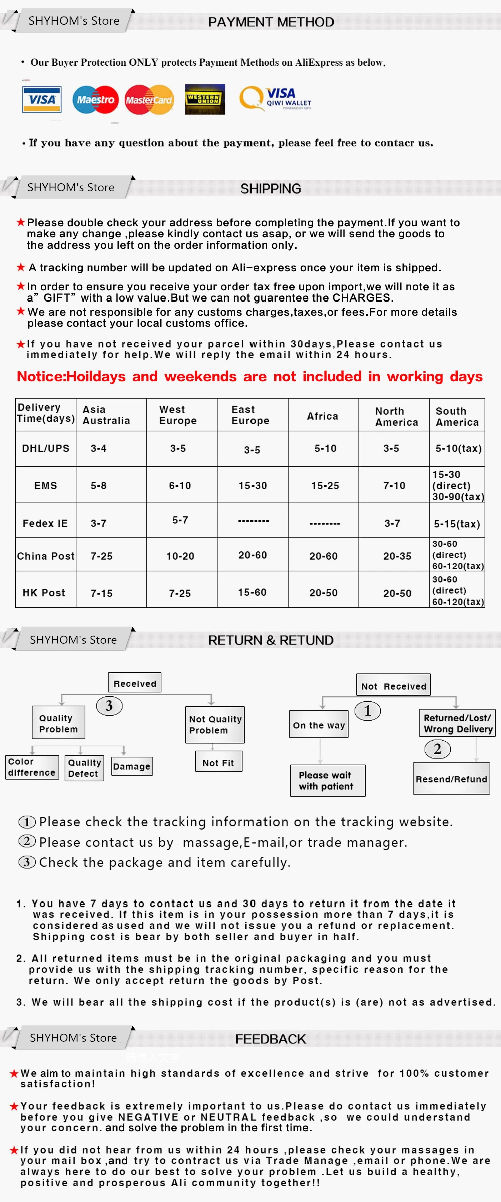 We are not responsible for any custom fees once the items have shipped. By purchasing our products, you consent that one or more packages may be shipped to you and may get custom fees when they arrive in your country.