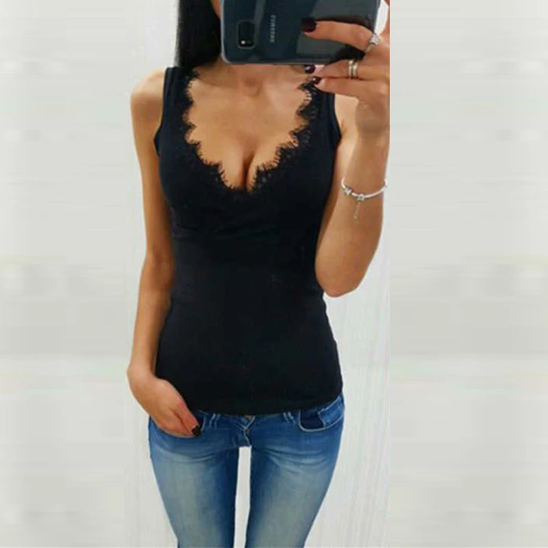 Feature:Women Summer Sexy V Neck Lace Close Fitting Sleeveless Top