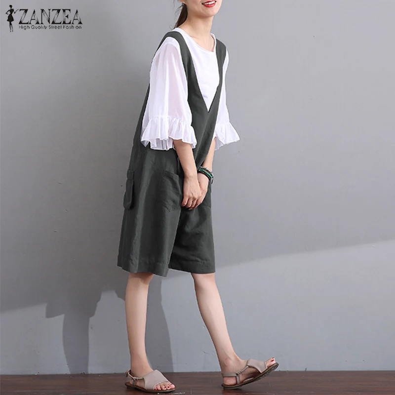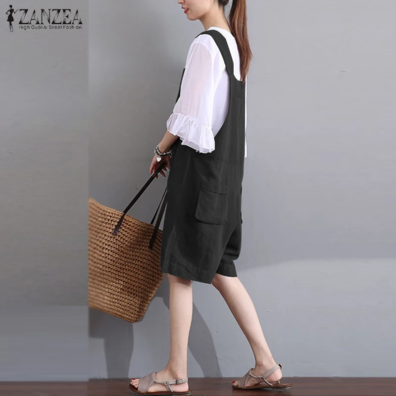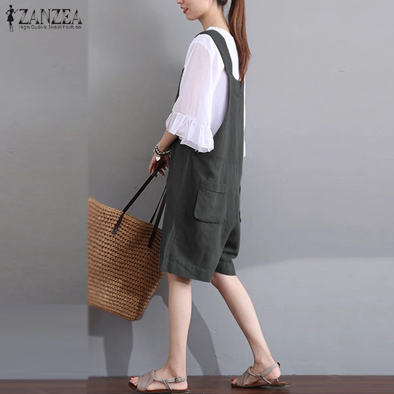 2018 ZANZEA Women Summer Jumpsuits V Neck Sleeveless Vintage Loose Rompers Short Overalls Casual Pockets Solid DungareePlus Size