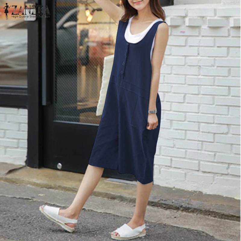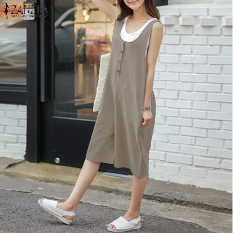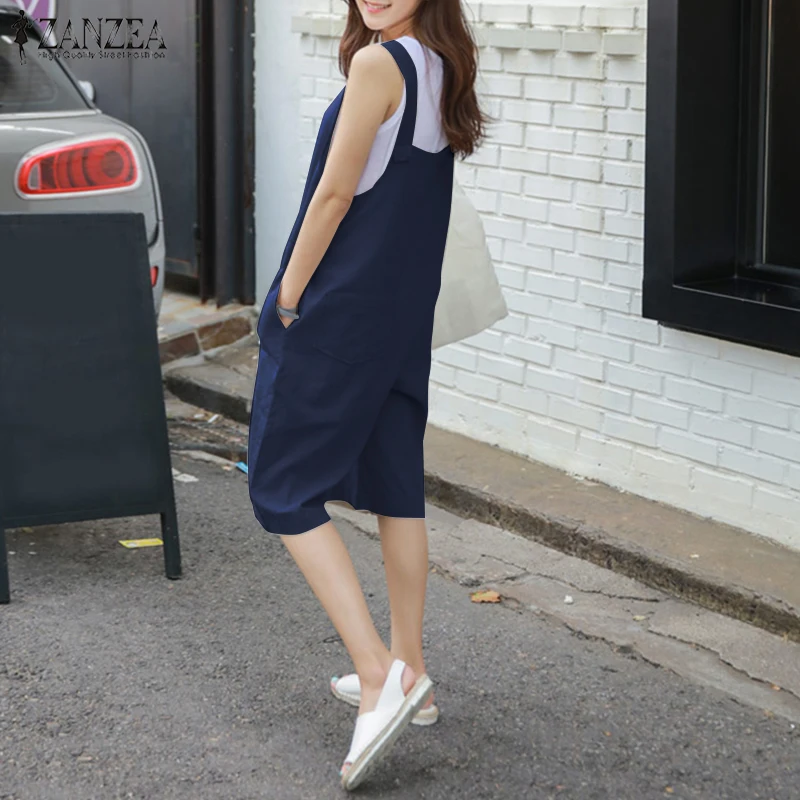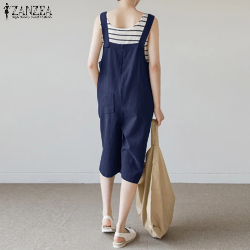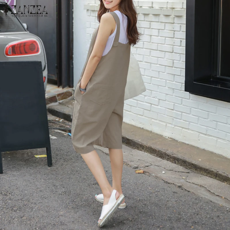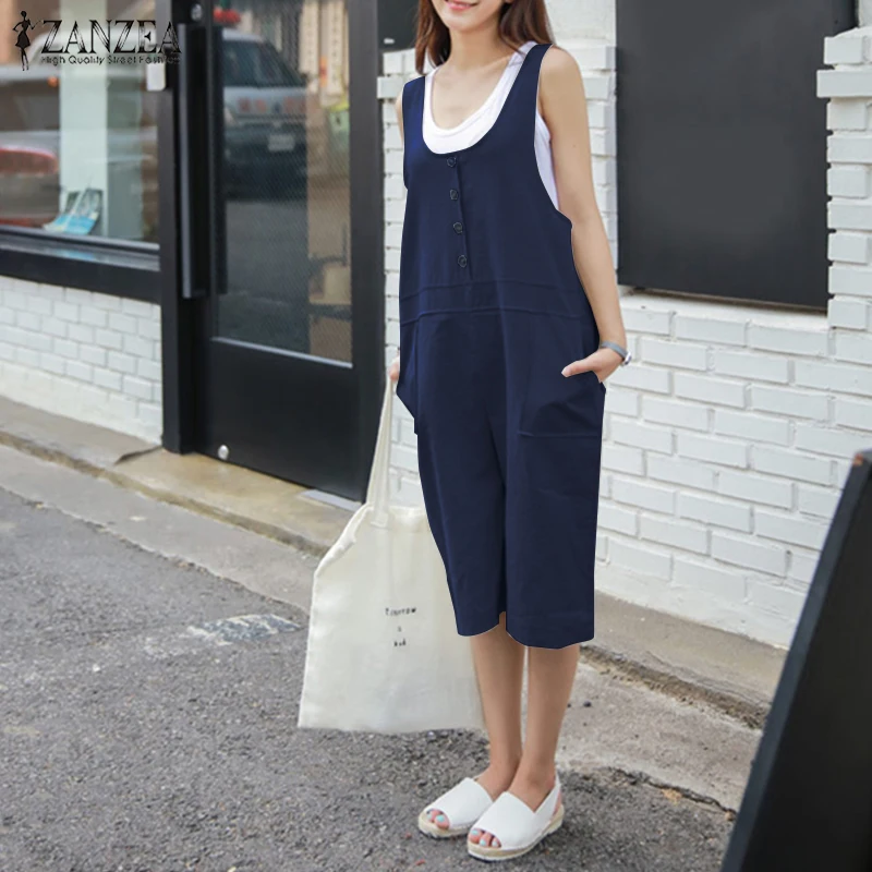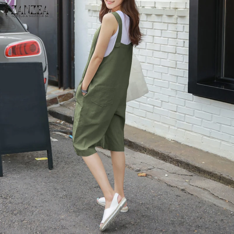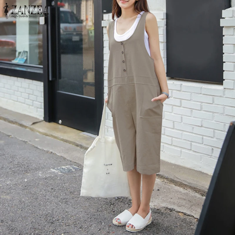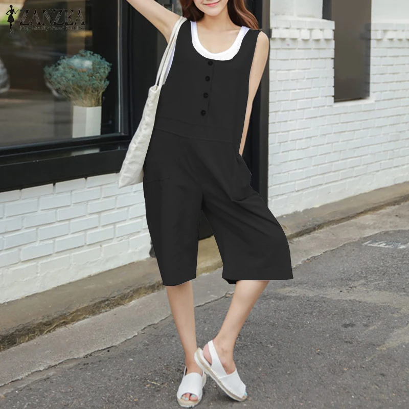2018 ZANZEA Women Summer Rompers Solid Loose Sleeveless Buttons Short Jumpsuits Casual Cotton Linen Overalls Playsuits Plus Size