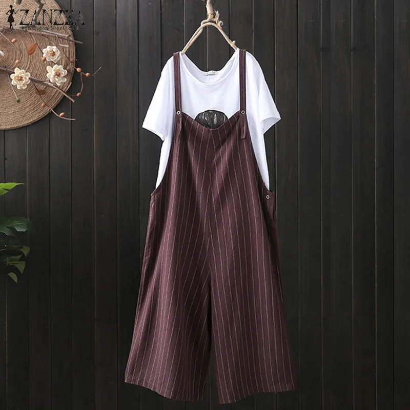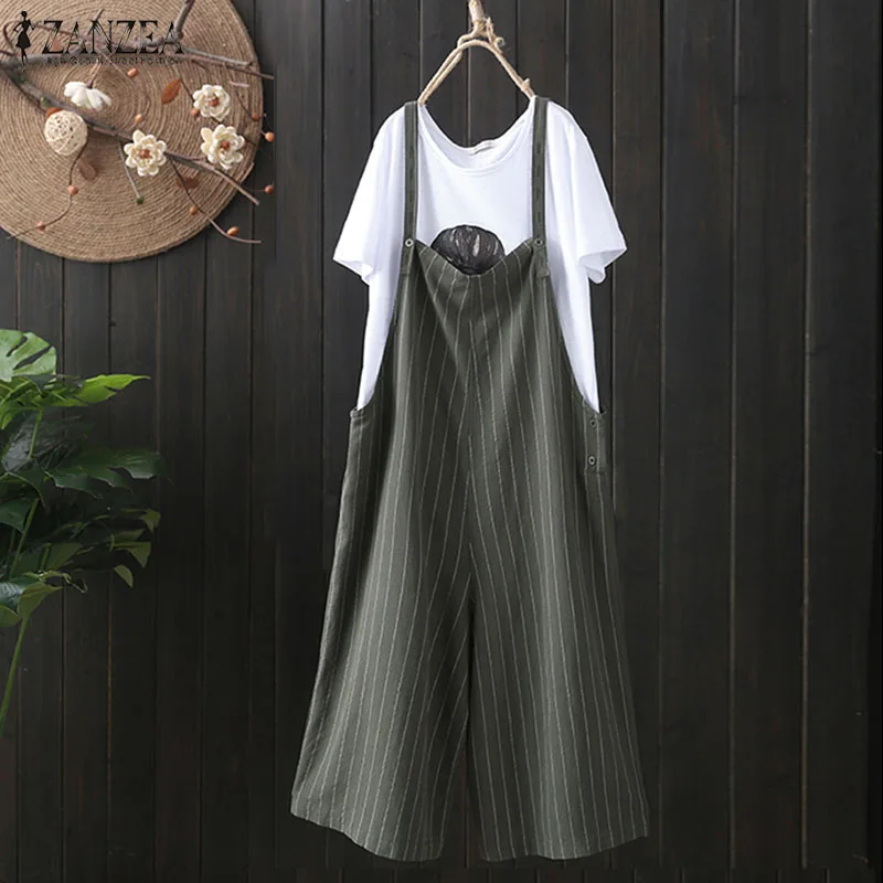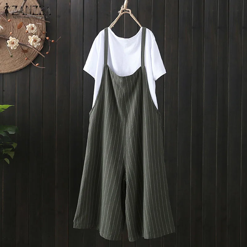 2018 ZANZEA Women Summer Strappy Sleeveless Ropmers Dungarees Cotton Linen Casual Loose Wide Leg Pants Stripe Jumpsuits Overalls