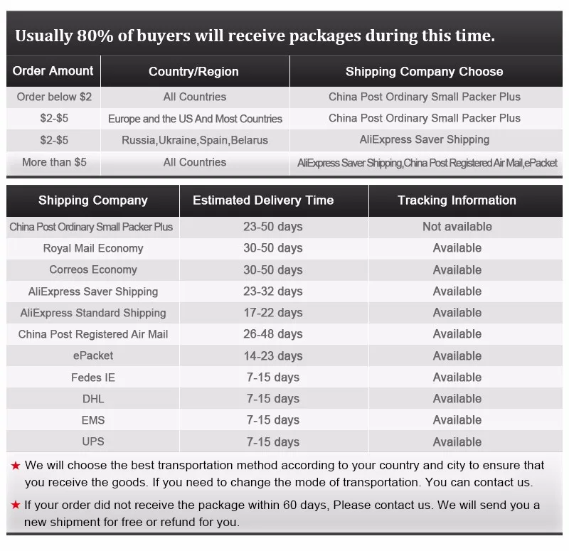 2.If the items are delivered during holidays, the shipping date will be delayed. If you are unhappy as transport time is delayed, please don`t give us negative feedback for it, because this is not our fault. Please email us and we will communicate with the express compa