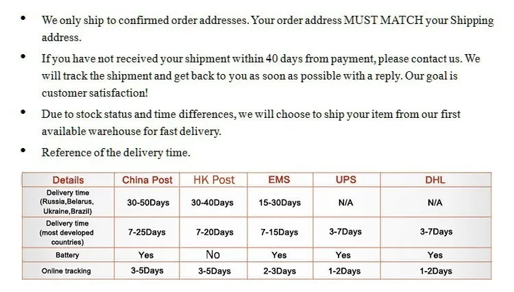Packages from our warehouse in China will be shipped by ePacket or EMS depending on the weight and size of the product. Packages shipped from our US warehouse are shipped through USPS.