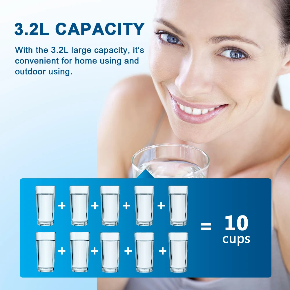 300 cups (476g per cup)/ 150 litres/40 gallons per filter. With the 3.2L large capacity, it’s convenient for home using and out door using. It is idea for cooking healthy food; rice becomes softer and more delicious; fuli flavor and better tasting of tea and coffee.