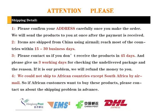 Packages from our warehouse in China will be shipped by ePacket or EMS depending on the weight and size of the product. Packages shipped from our US warehouse are shipped through USPS.