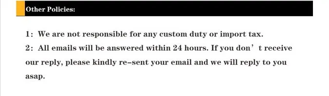 We are not responsible for any custom fees once the items have shipped. By purchasing our products, you consent that one or more packages may be shipped to you and may get custom fees when they arrive in your country.