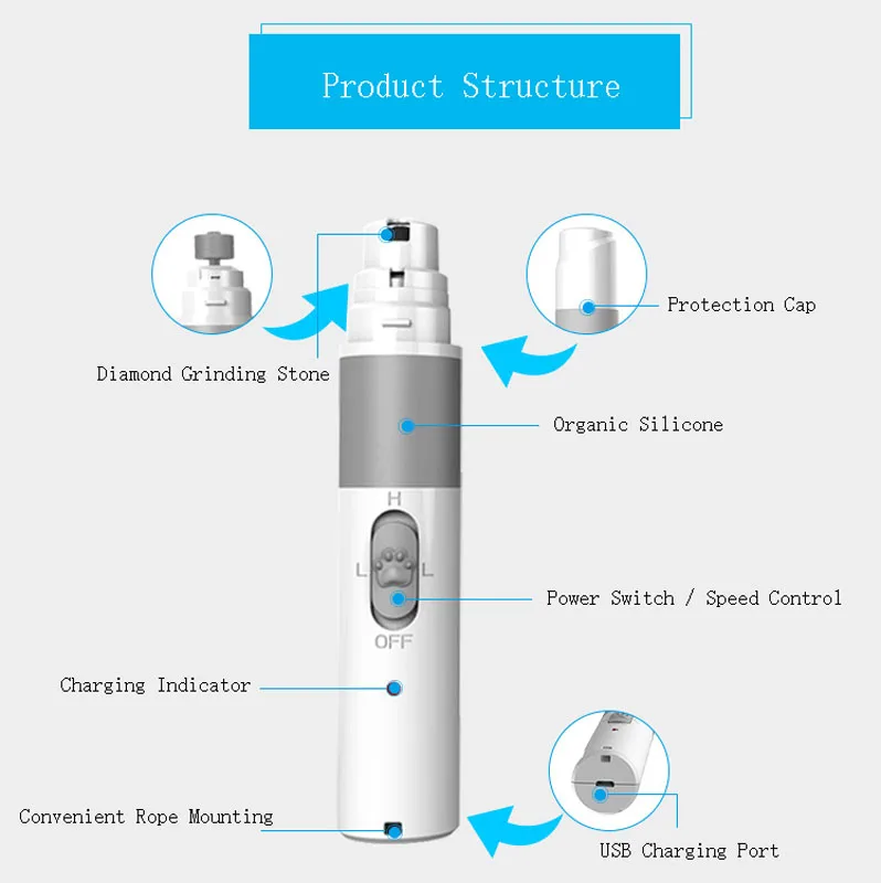 • If the pet is the first time to use nail grinder, it is recommended that the sharp fingernail or long wear parts should be grinded firstly, but not too much, avoid causing bleeding.