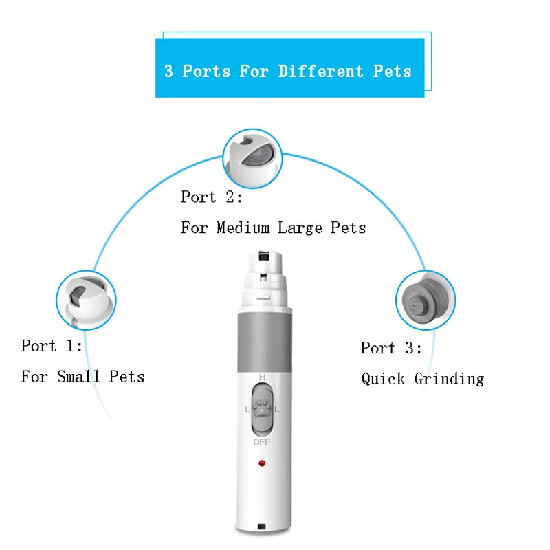 • Step 1: According to pet’s size and nails characteristics, select the suitable port for your pet. Port 1 is for small-sized pets to grind nails; Port 2 is for medium and large pets, Port 3 for fast Grinding.