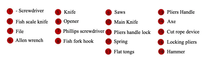 Pliers , Phillips Screwdriver , Double-sided Knife , Saws , Knife , Opener , Cut wire device , Hammer