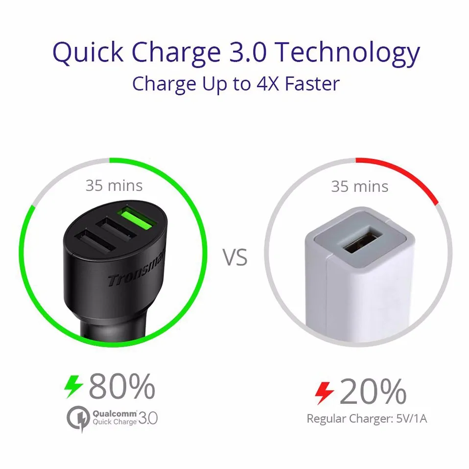 - Qualcomm Quick Charge 3.0: The latest, fastest and most efficient USB charging technology in the world. Up to 4X faster than standard chargers, able to charger compatible devices to 80% in just 35 minutes. Output 3.6-6.5V/3.0A, 6.5-9V/2.0A, 12V/1.5A(Max).