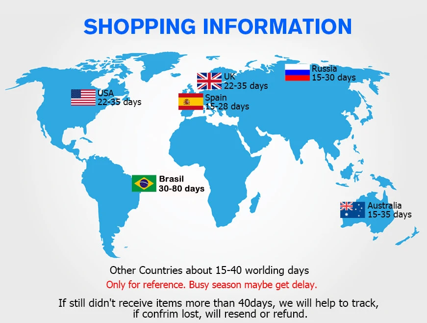 5. If you have not received your shipment within 30 days from payment, please contact us. We will track the shipment and get back to you as soon as possible with a reply. Our goal is customer satisfaction!