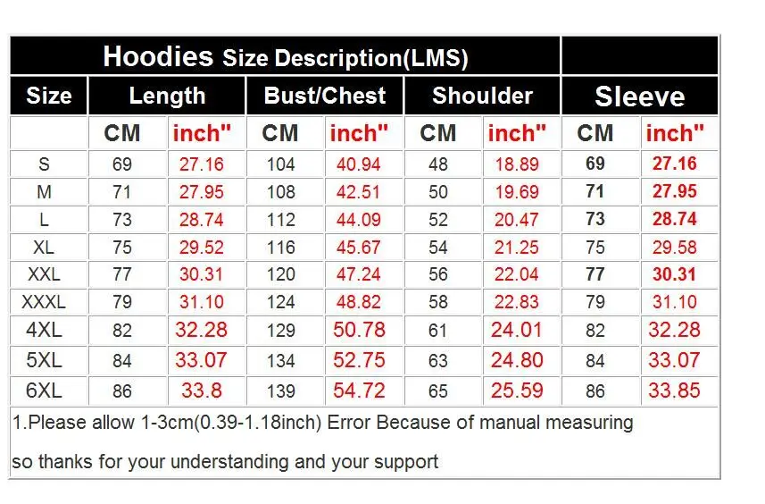 | Tops Size | S / M / L /XL / 2XL / 3XL/ 4XL/ 5XL/ 6XL | ||||||||