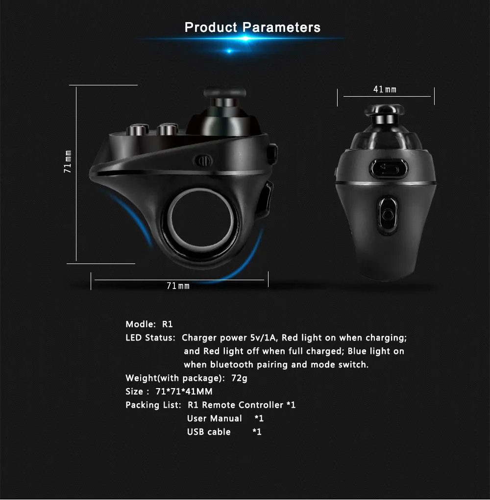 LED Status: Charger power 5V/1A, red light on when charging, and red light off when full charged; Blue light on when Bluetooth pairing and mode switch.