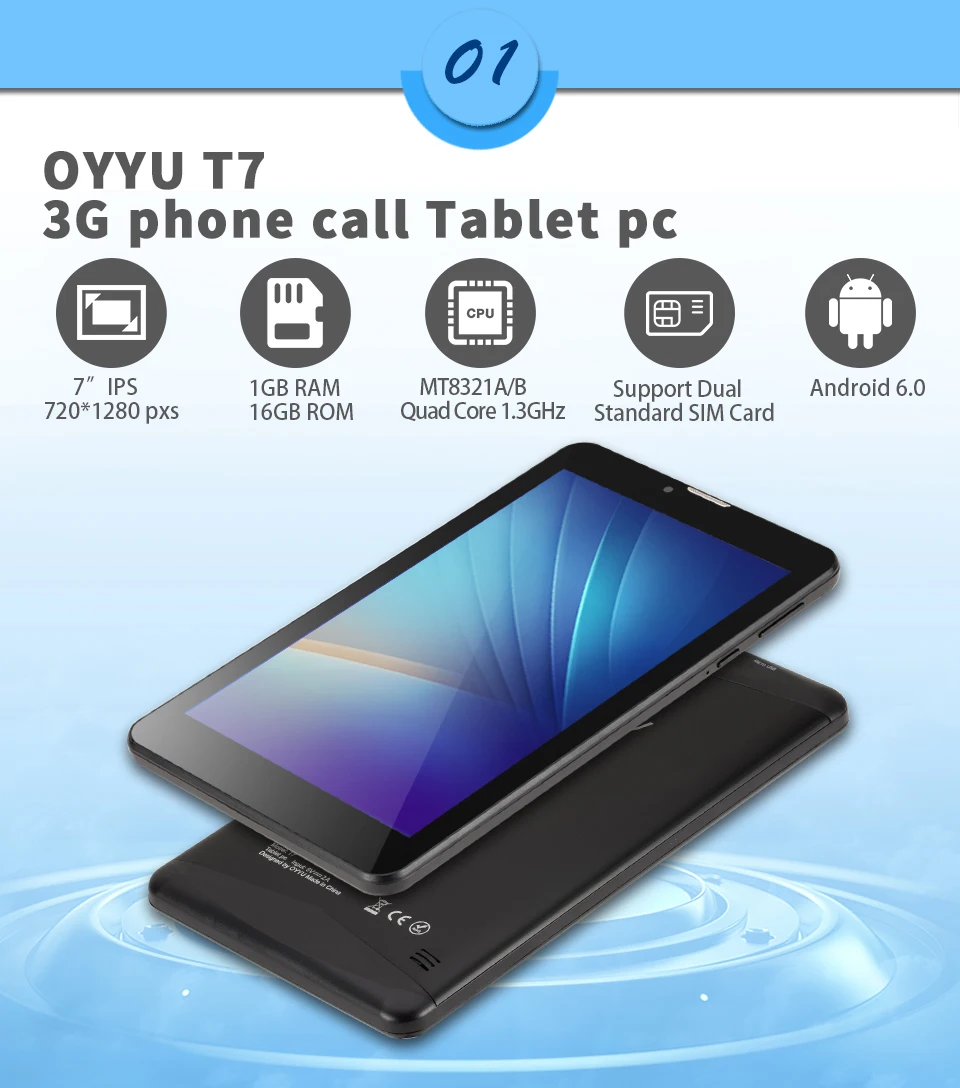 Brand: OYYU Model: T7 3G phone call Tablet Pc OS: Andriod 6.0 marshmallow CPU: MT8321A/B quad Core 1.3GHz (if you use software to test the chipset, it may show 8321M) Core: MT8163B Quad GPU: Mali 400 Color: Metal Back