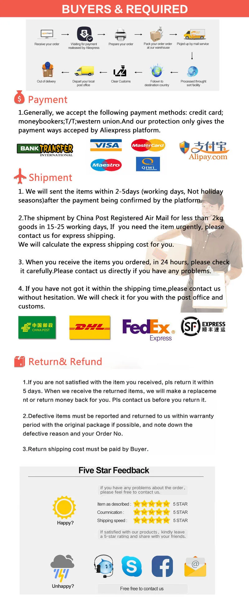 • If you did not receive the product within the guaranteed time( 45 days not including 2-5 day processing) you can request a refund or a reshipment.