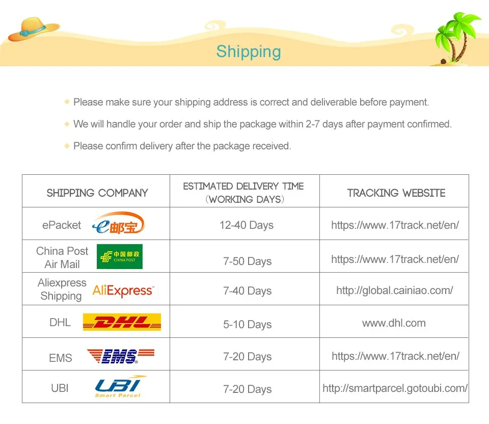 Packages from our warehouse in China will be shipped by ePacket or EMS depending on the weight and size of the product. Packages shipped from our US warehouse are shipped through USPS.