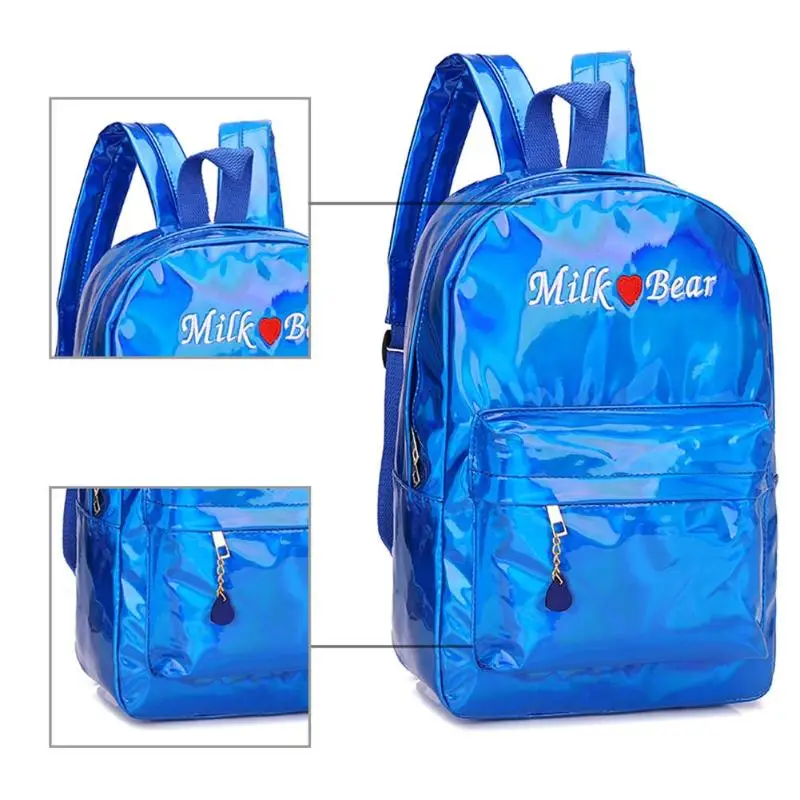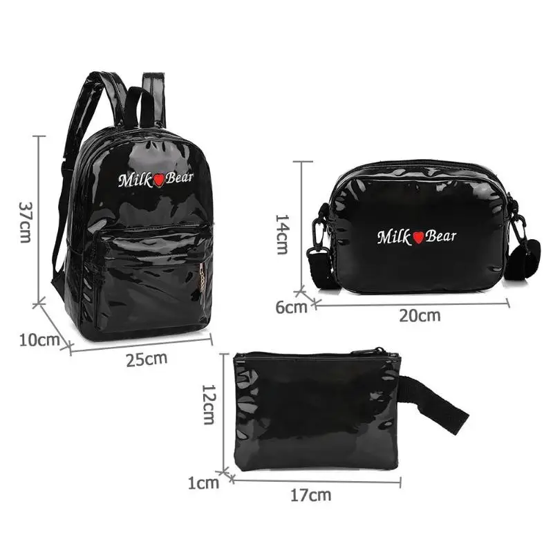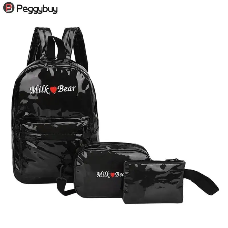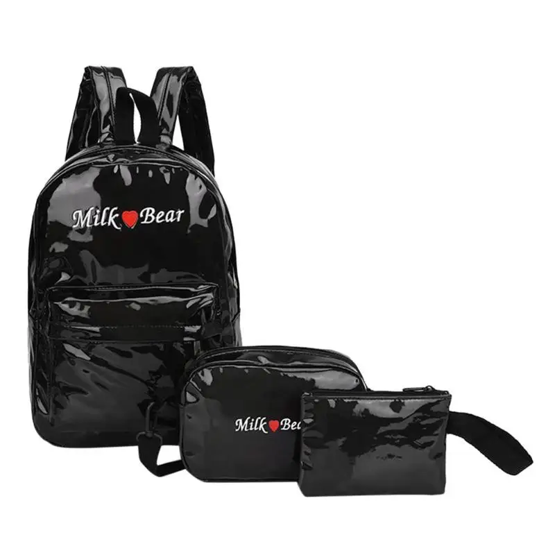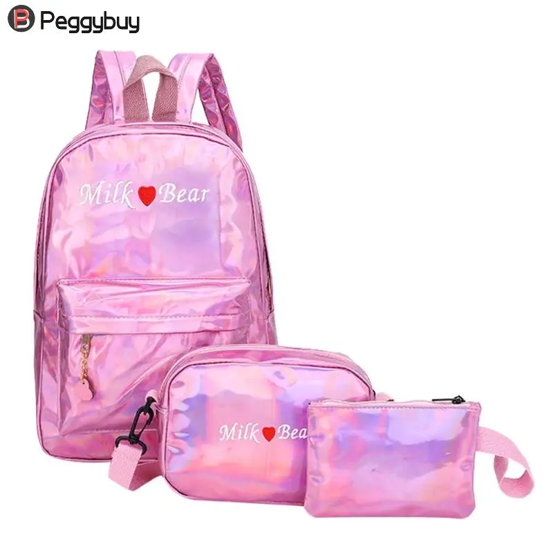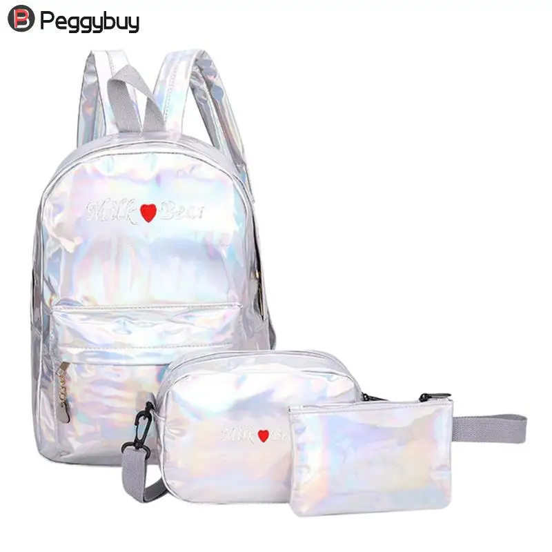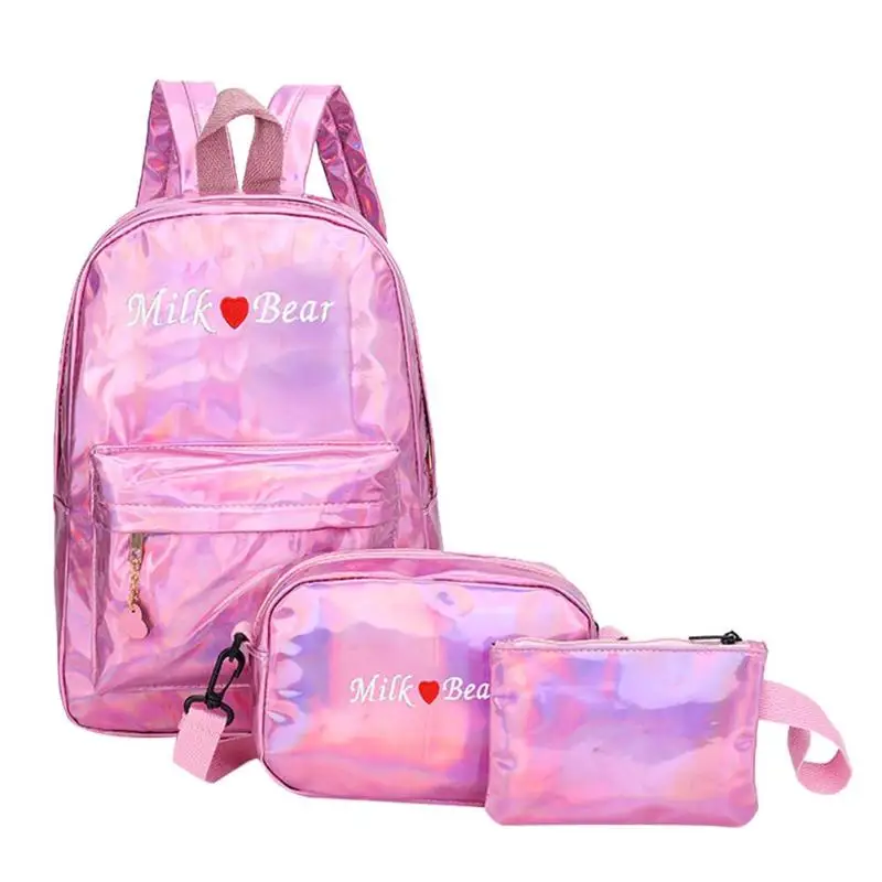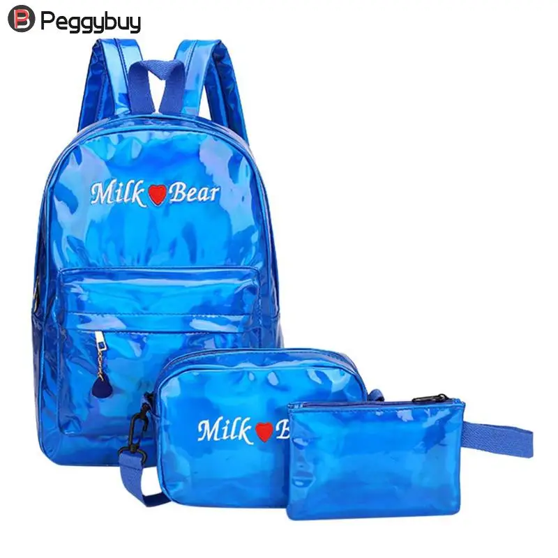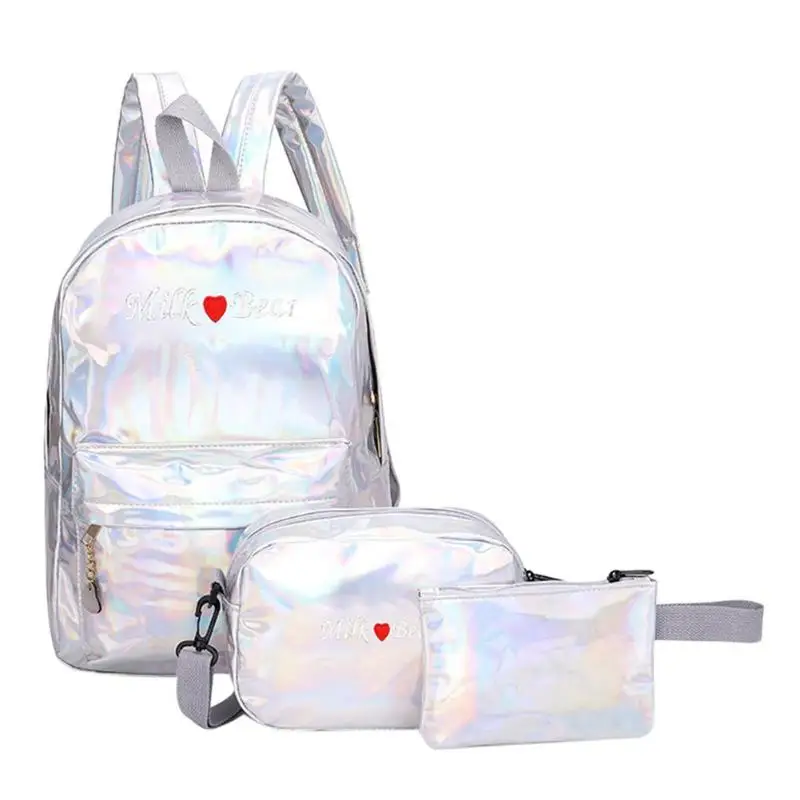 3pcs/Set Street Women/Men Teen PU Leather Laser Backpacks Students Zipper Shoulder Schoolbags Composite Clutch