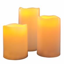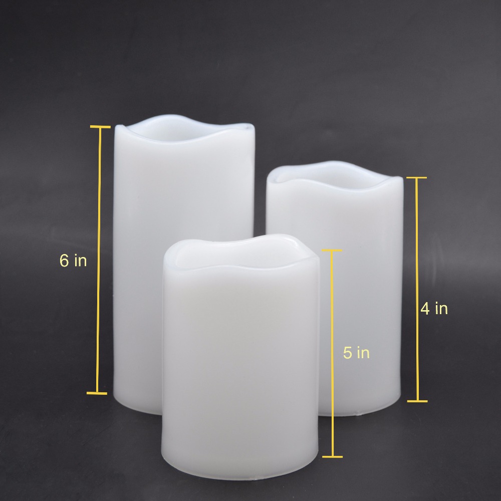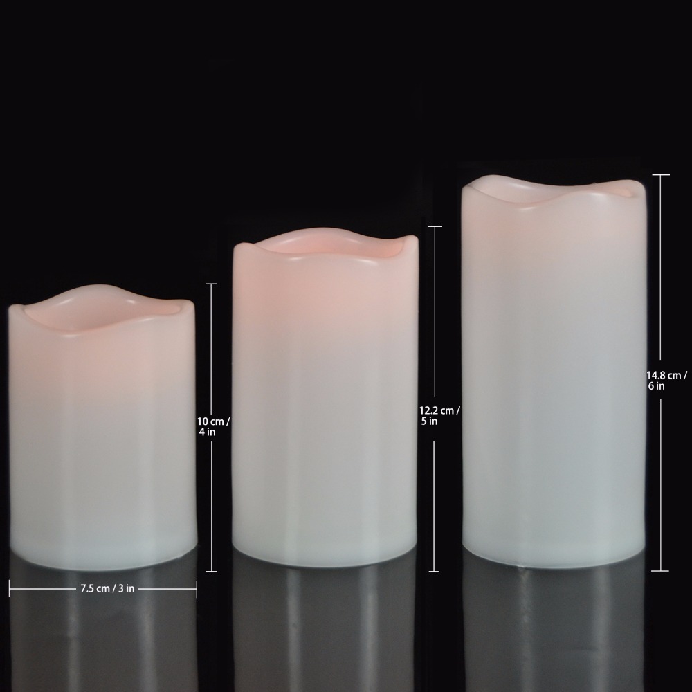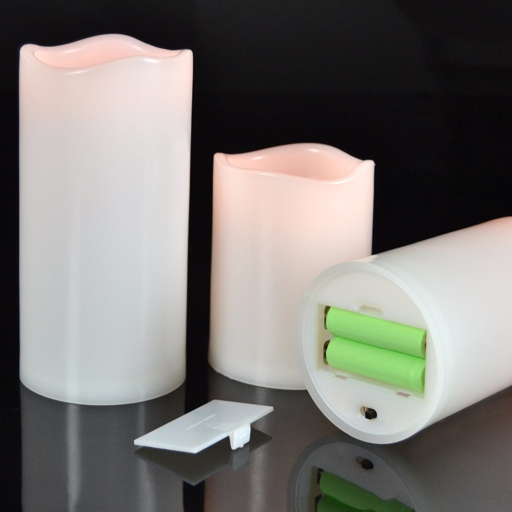 Product Plastic LED candle set of 3 Material Plastic Battery 2AA(Not included) Packing 3pcs/set in colorful packing box N.W. 350g/set Litttle size 7.5cm * 10cm Middle size 7.5cm * 12.5cm Large size 7.5cm * 15cm Packing size 27*9*16cm