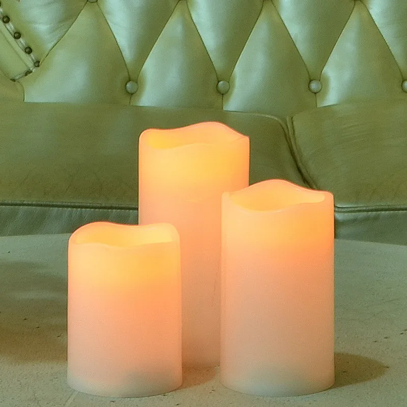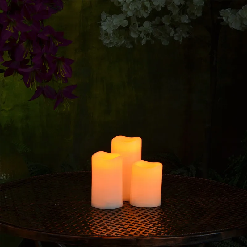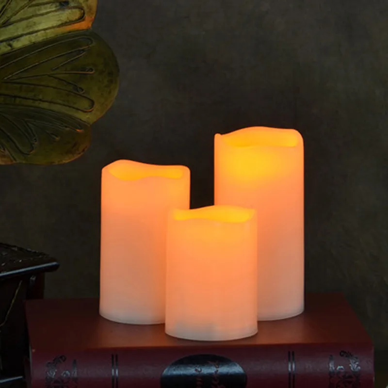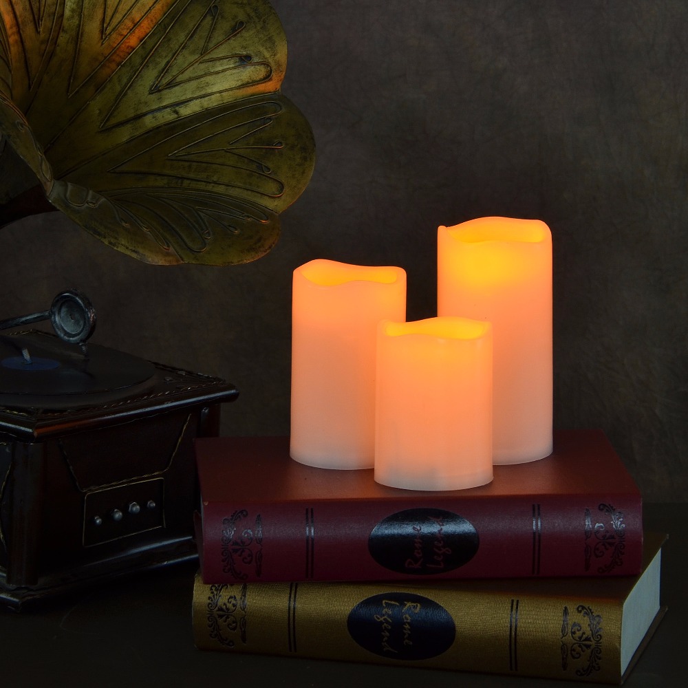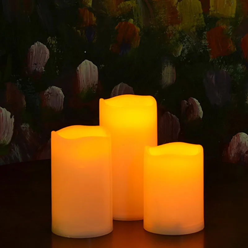 Product Plastic LED candle set of 3 Material Plastic Battery 2AA(Not included) Packing 3pcs/set in colorful packing box N.W. 350g/set Litttle size 7.5cm * 10cm Middle size 7.5cm * 12.5cm Large size 7.5cm * 15cm Packing size 27*9*16cm
