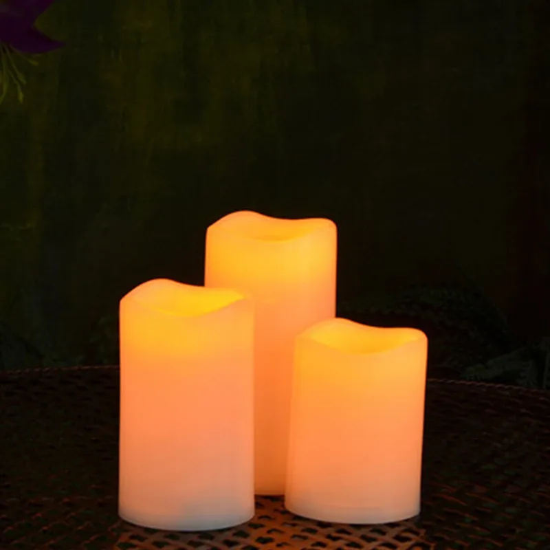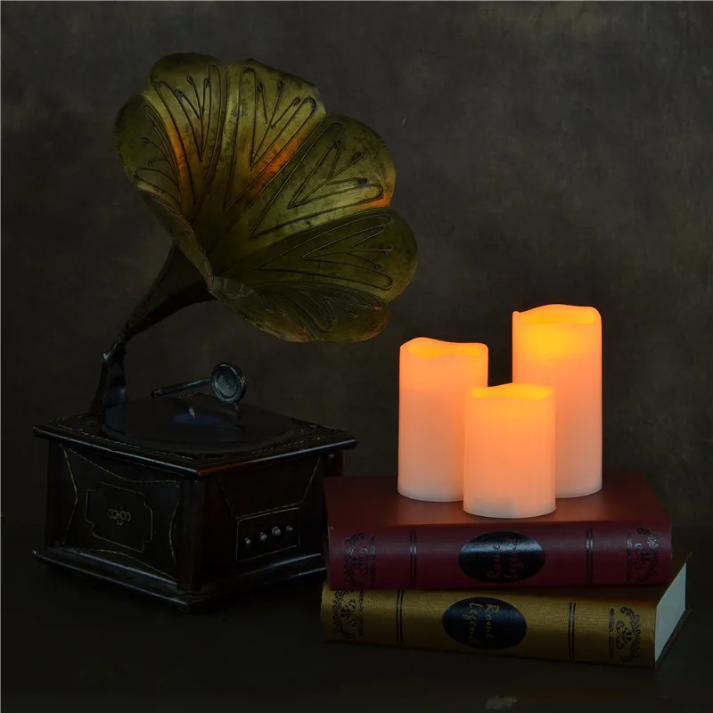 Product Plastic LED candle set of 3 Material Plastic Battery 2AA(Not included) Packing 3pcs/set in colorful packing box N.W. 350g/set Litttle size 7.5cm * 10cm Middle size 7.5cm * 12.5cm Large size 7.5cm * 15cm Packing size 27*9*16cm