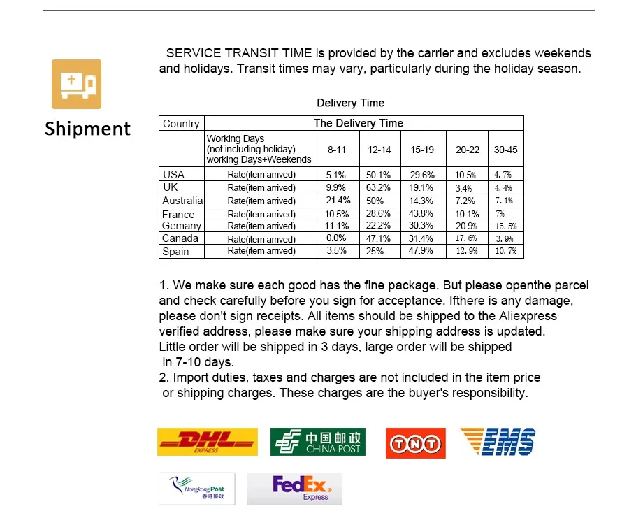 Packages from our warehouse in China will be shipped by ePacket or EMS depending on the weight and size of the product. Packages shipped from our US warehouse are shipped through USPS.