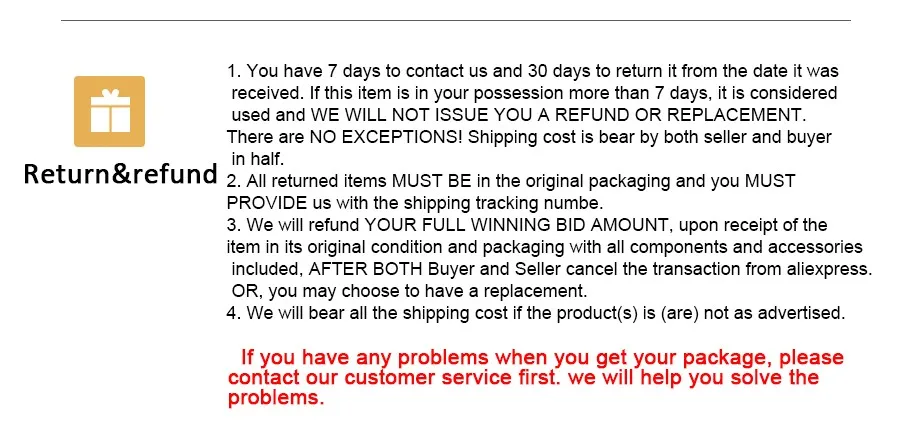 • If you do not want the product you’ve received you may request a refund but you must return the item at your expense and the item must be unused.