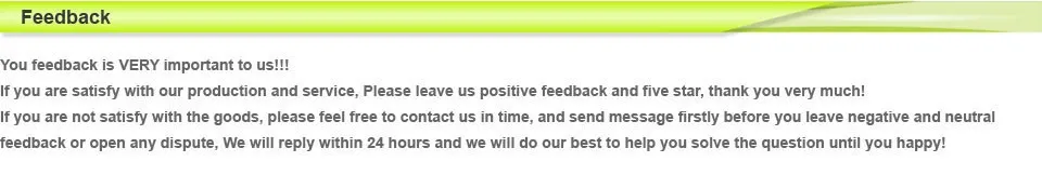 5. We will leave the positive feedback to all our kind buyers,If you are satisfied with the items you ordered, please leave us a 5 star positive feedback, thanks very much.